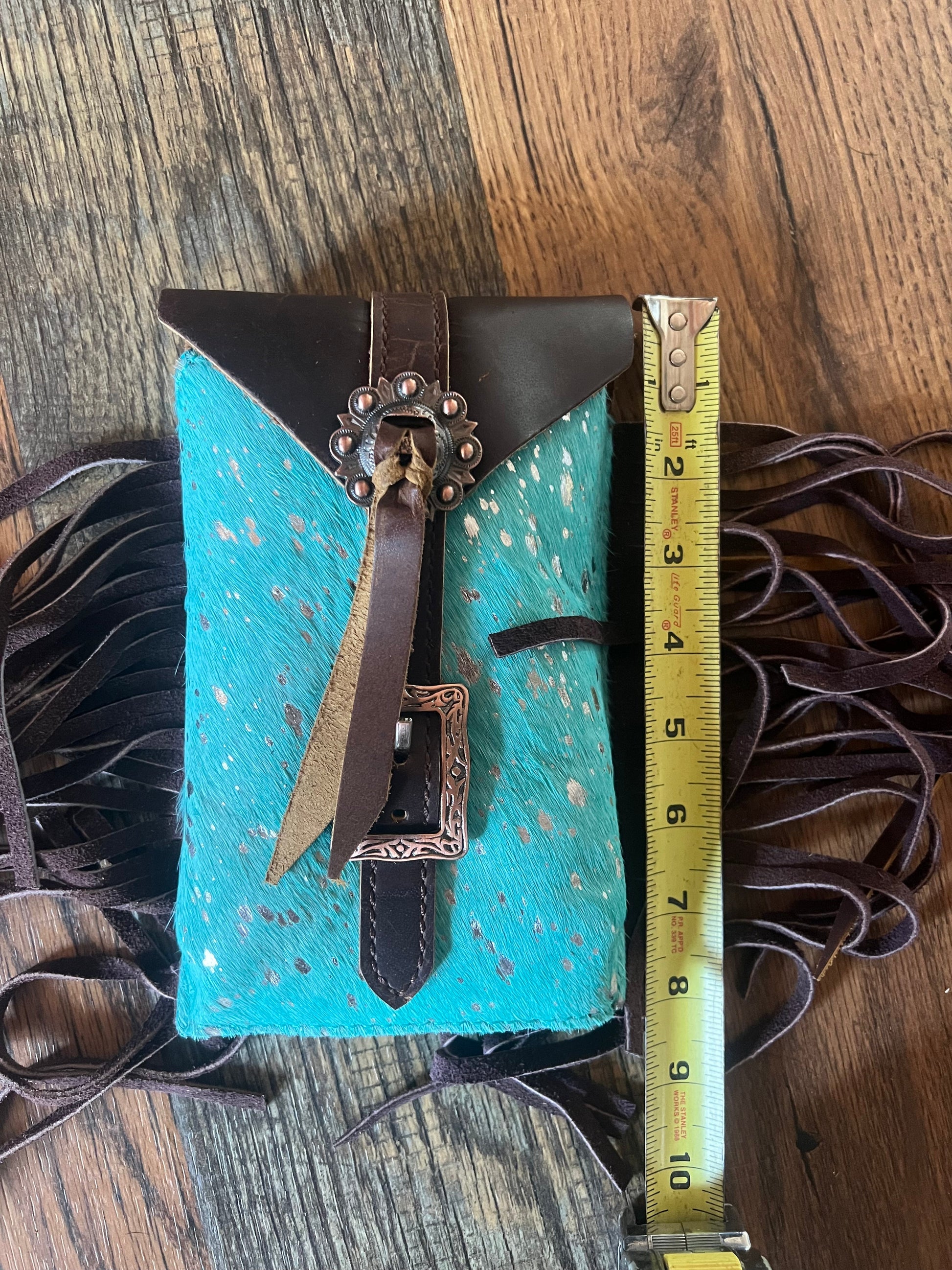 Acid Wash Teal Hair on Cowhide Saddle Bag. Ideal for your phone, keys, money, snacks, etc. Measures 8.5" X 5"