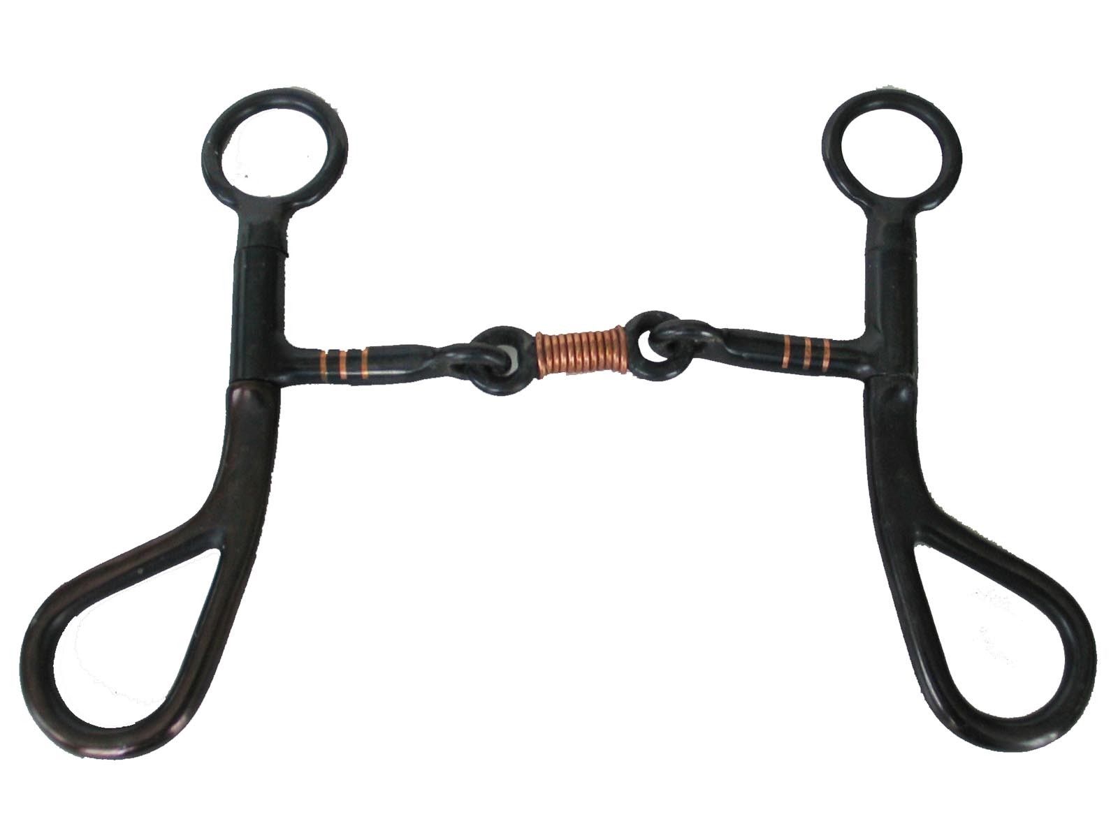The AJ Tack Argentine Three Piece Copper Wire Bit is designed for colt training and refinement. This black steel bit features a 5" three-piece dog bone snaffle mouth with copper wire wrapped around the dog bone and copper inlays on the bars to encourage salivation and promote a soft, responsive mouth. The 5 1/2" black steel cheeks provide stability and durability, making this bit a great option for working with young horses and improving communication during training.