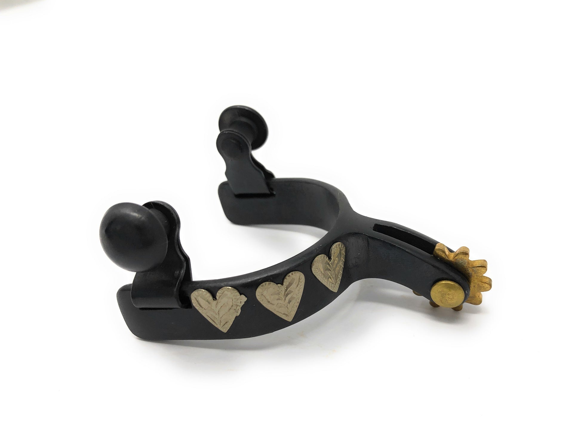Celebrate your little one’s western roots with the AJ Tack Baby Hearts Spurs. These adorable baby-sized spurs feature an antique brown finish with hand-engraved silver heart overlays on the band, adding a touch of love and charm. Whether gifted as a baby shower present, displayed in a nursery, or cherished as a keepsake, these spurs are a sweet way to honor your baby’s western heritage.
