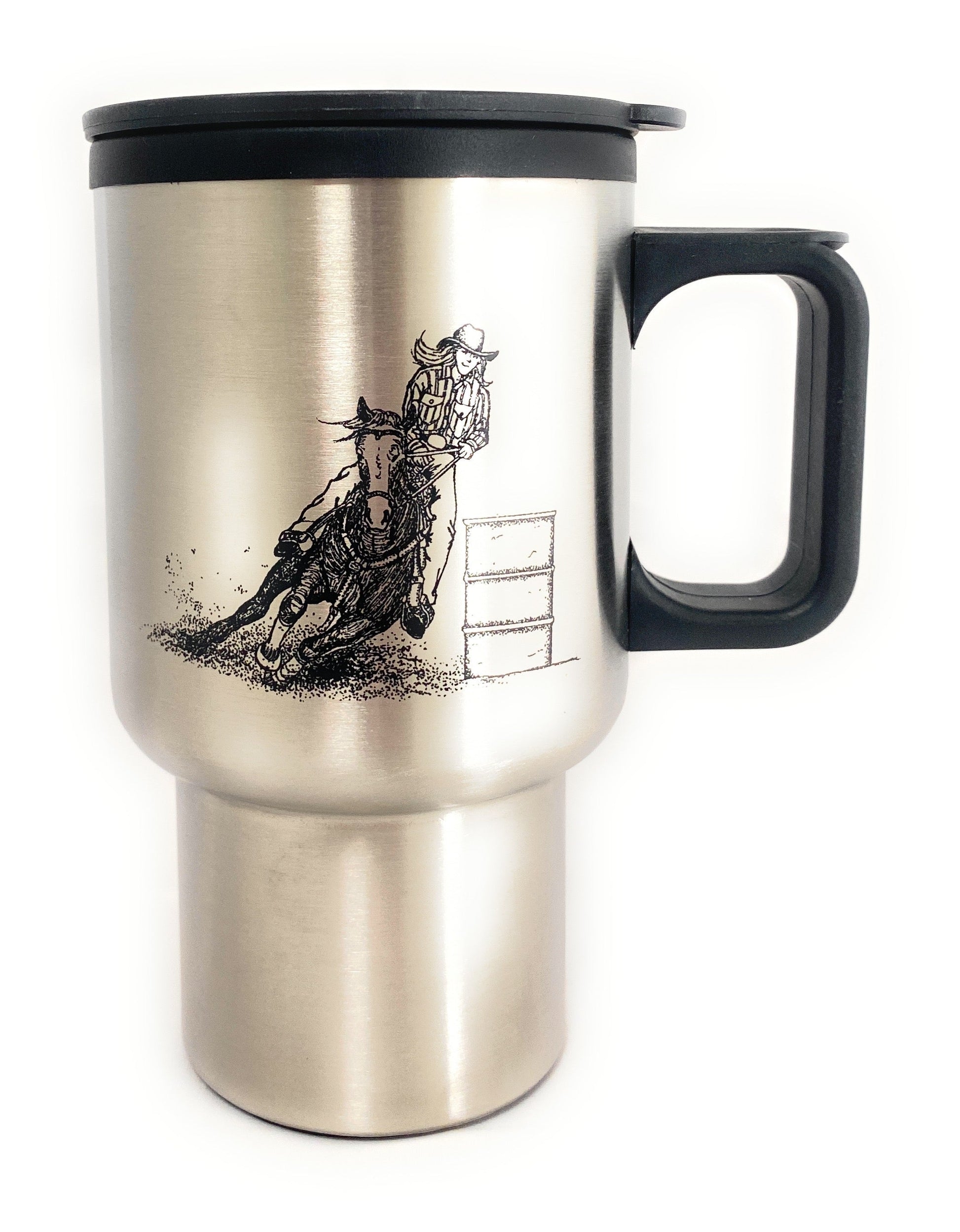 Enjoy your favorite beverage on the go with the AJ Tack Stainless Steel Travel Mug. Designed for durability and convenience, this 14 oz travel mug features a sleek stainless steel shell with an easy-to-clean finish. Its narrow bottom ensures a secure fit in most cup holders, making it perfect for travel, work, or the barn. The plastic interior sleeve helps retain temperatures, while the spill-resistant lid with a slider opening adds to its practicality. Finished with a unique western-themed graphic, this mug is both stylish and functional.