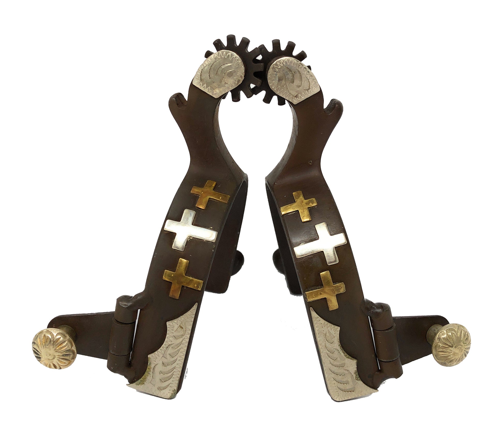 Let your young rider stand out in the show pen with these AJ Tack Youth Western Spurs. Finished in a rich antique brown, these spurs feature a striking trio of crosses — two in brass, one in silver — set against a hand-engraved silver overlay. The 3/4" band offers a bold yet refined look, accented by floral-engraved buttons and 12-point rowels for a classic Western finish. Sized just right for youth riders with a 2 5⁄8" opening and 2 1⁄2" depth, these spurs balance form and function with eye-catching style. Please note: not compatible with jingle bobs.