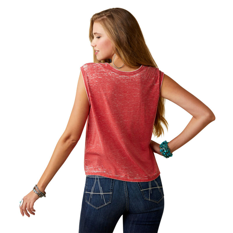 Patriotic pride. Ariat® style. This jersey tank lets you rep the USA in the comfort of a slightly cropped, relaxed fitting tank. Raw edges and a split neckline complete the look.