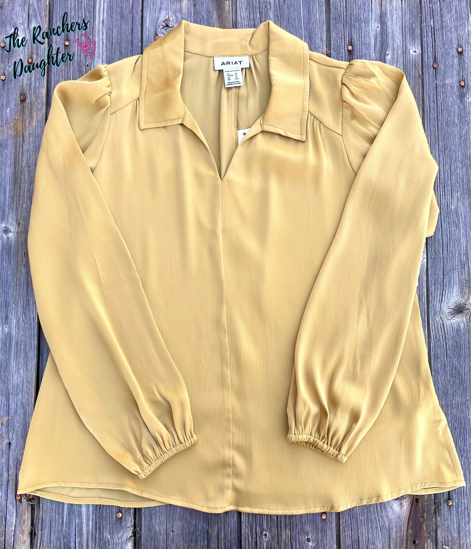 This elegant satin top has a flair for the dramatic. With its golden hue, glossy sheen, and billowy sleeves, it turns any outfit into a moment. The perfect plus-one for all your holiday events.