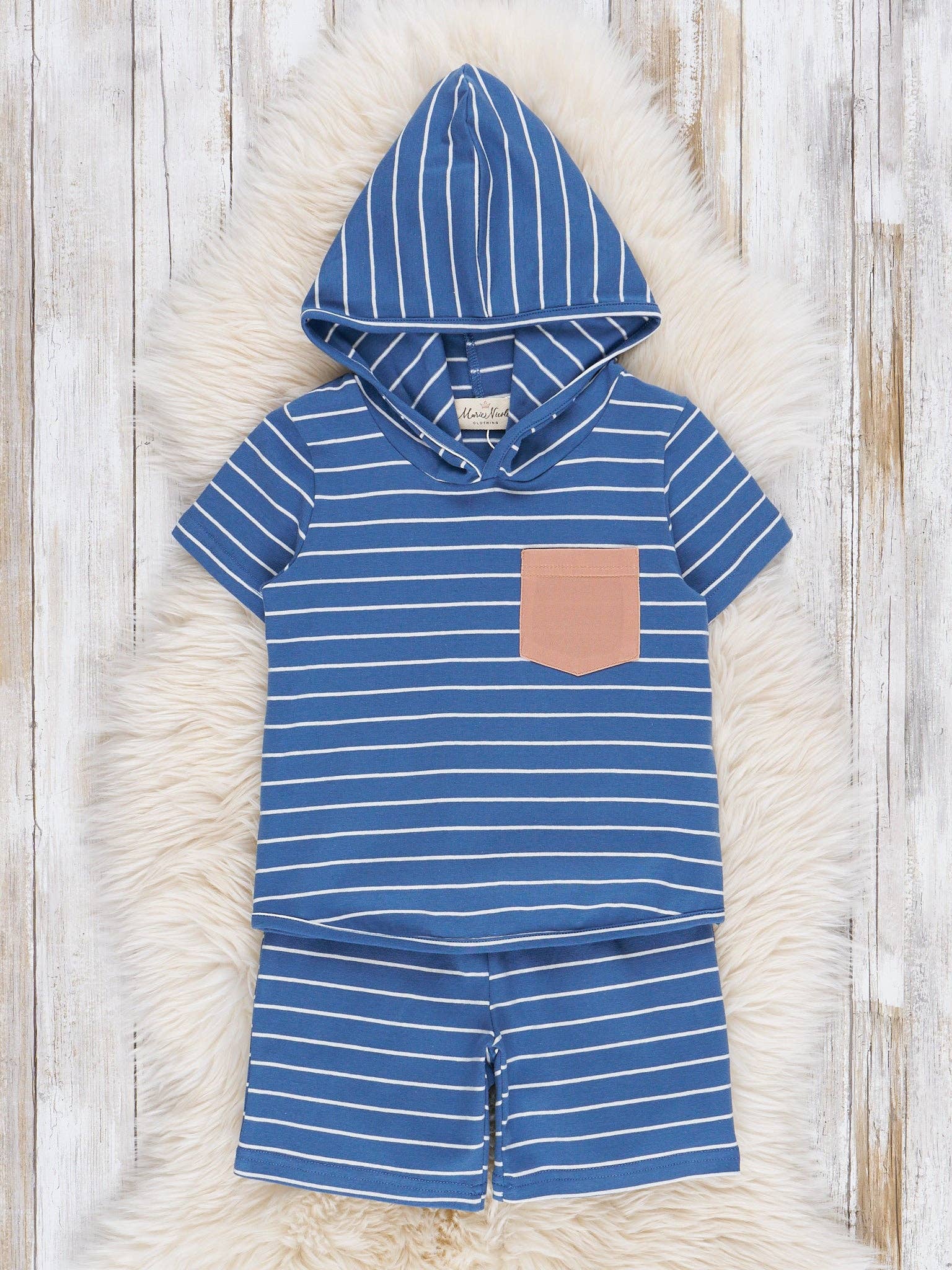 Stay cool in this summer-ready boys outfit with an elastic waist shorts and a stylish short-sleeved hoodie top with pocket detail. Made specially for Marie Nicole Clothing, its vibrant blue stripes add a playful touch to any wardrobe. Perfect for lazy days and outdoor adventures. * Fits true to size. * Top: 97% Cotton / 3% Spandex * Combo: 95% Polyester / 5% Spandex * Bottoms: 97% Cotton / 3% Spande.