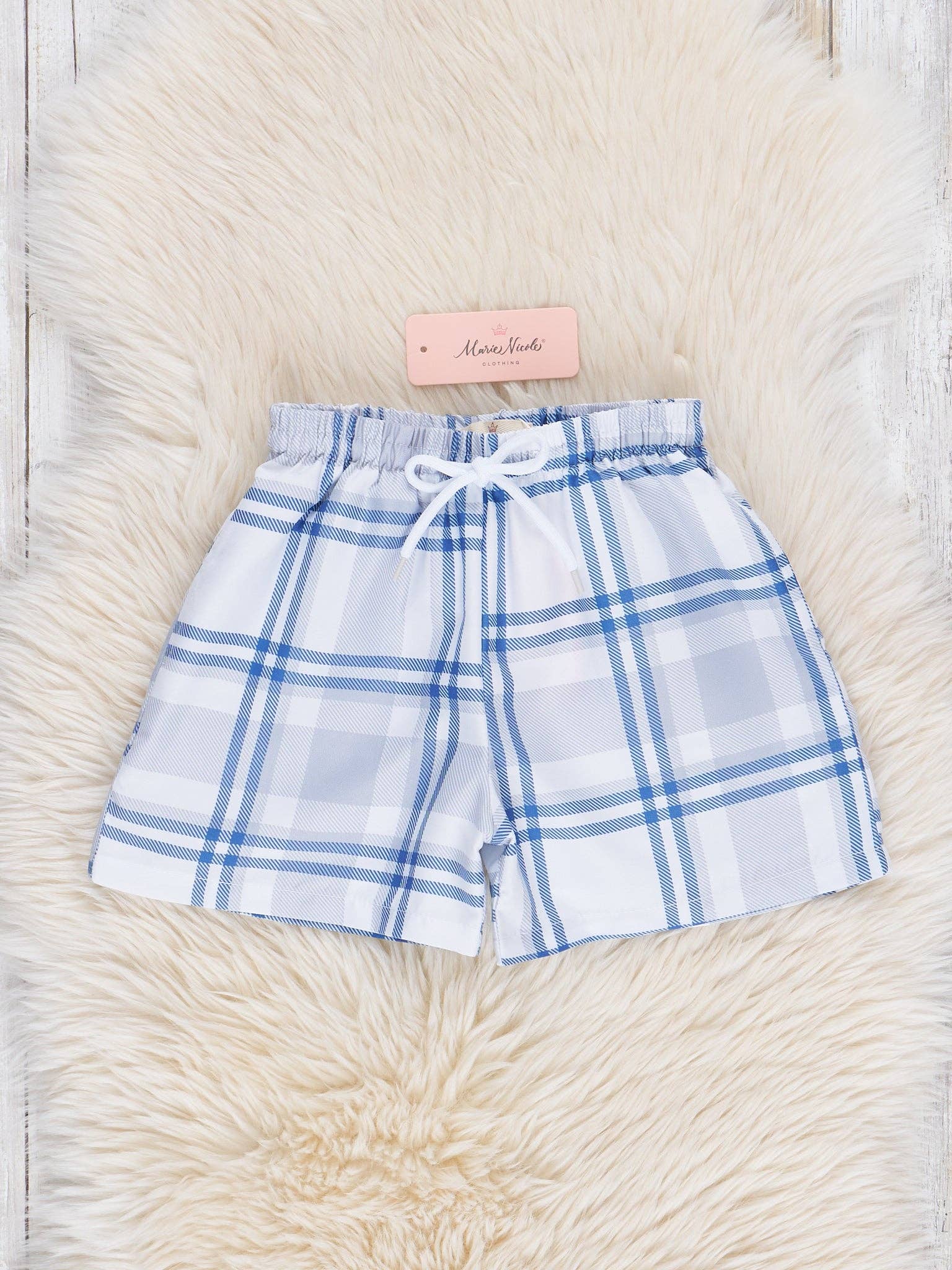 Get ready to make a splash with these Plaid Swim Trunks! This matching set is perfect for pool days and beach trips. Designed by Marie Nicole Clothing, these boy's swim trunks feature a blue plaid pattern and an elastic waist with drawstring for the perfect fit. Summer just got a whole lot cooler!
