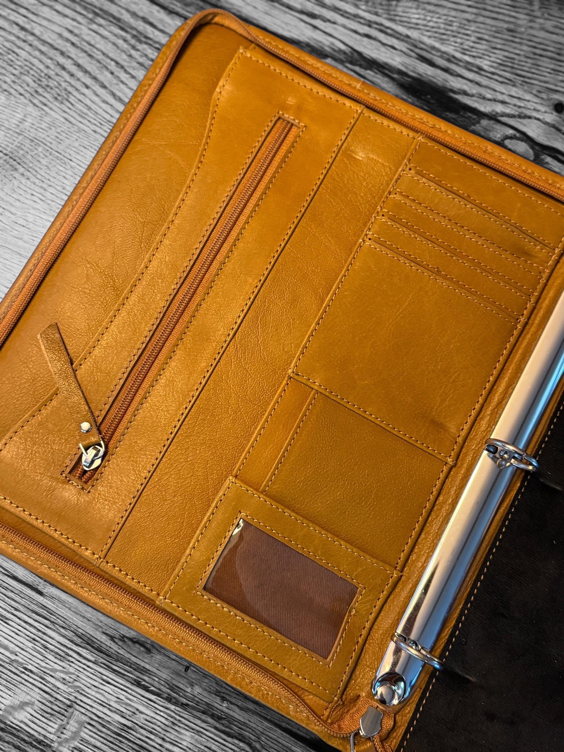 Features: Tooled leather with cowhide cover, smooth back, Full zipper closure, 1" three ring binder, legal pad clip, multiple card slots, pen zipper pocket, expandable paper slot