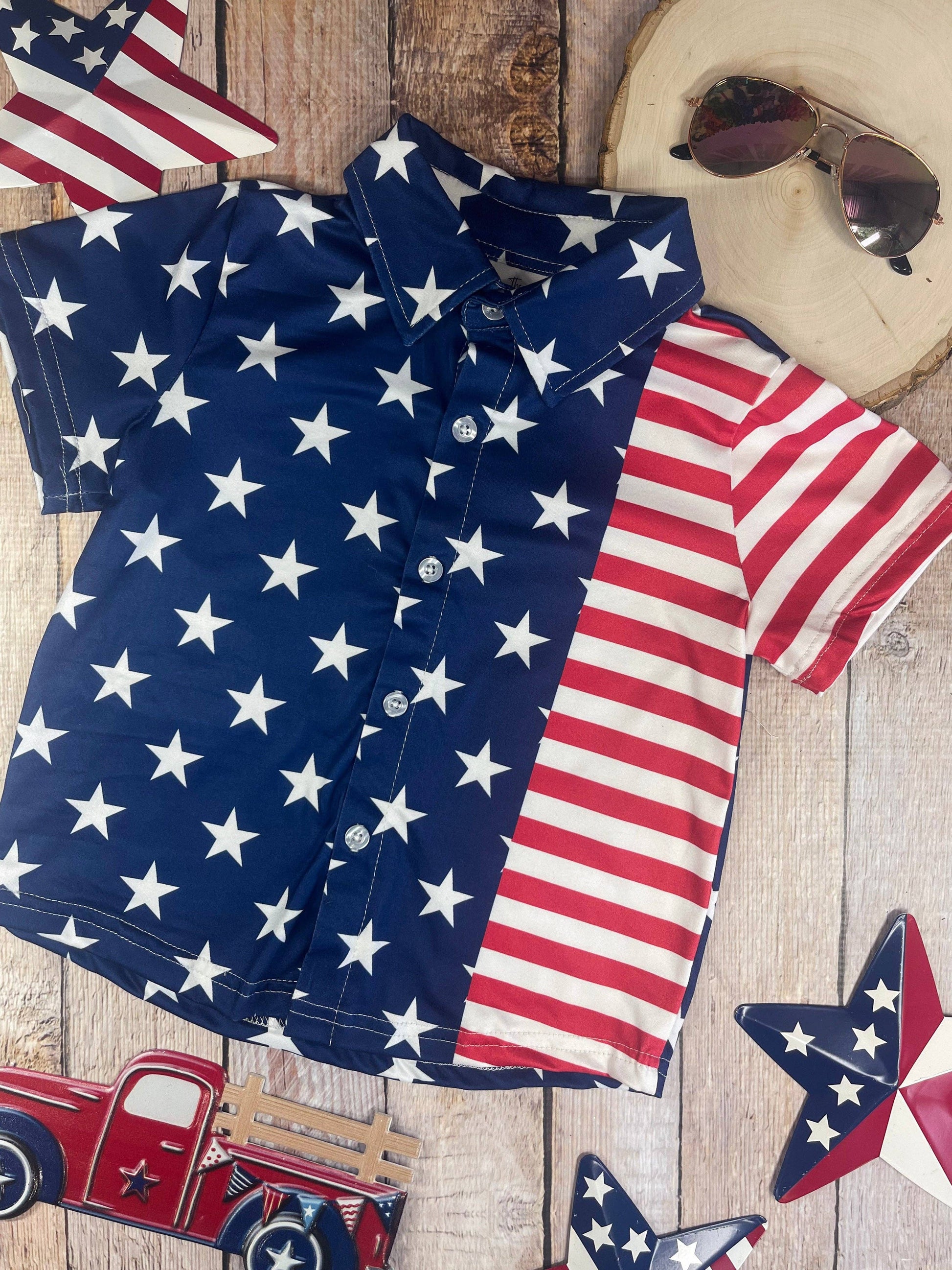 This stylish button down shirt showcases the classic American flag, perfect for any young patriot. With its fashionable design, your little one will make a statement while staying comfortable. Show off your love for this great nation with every wear.