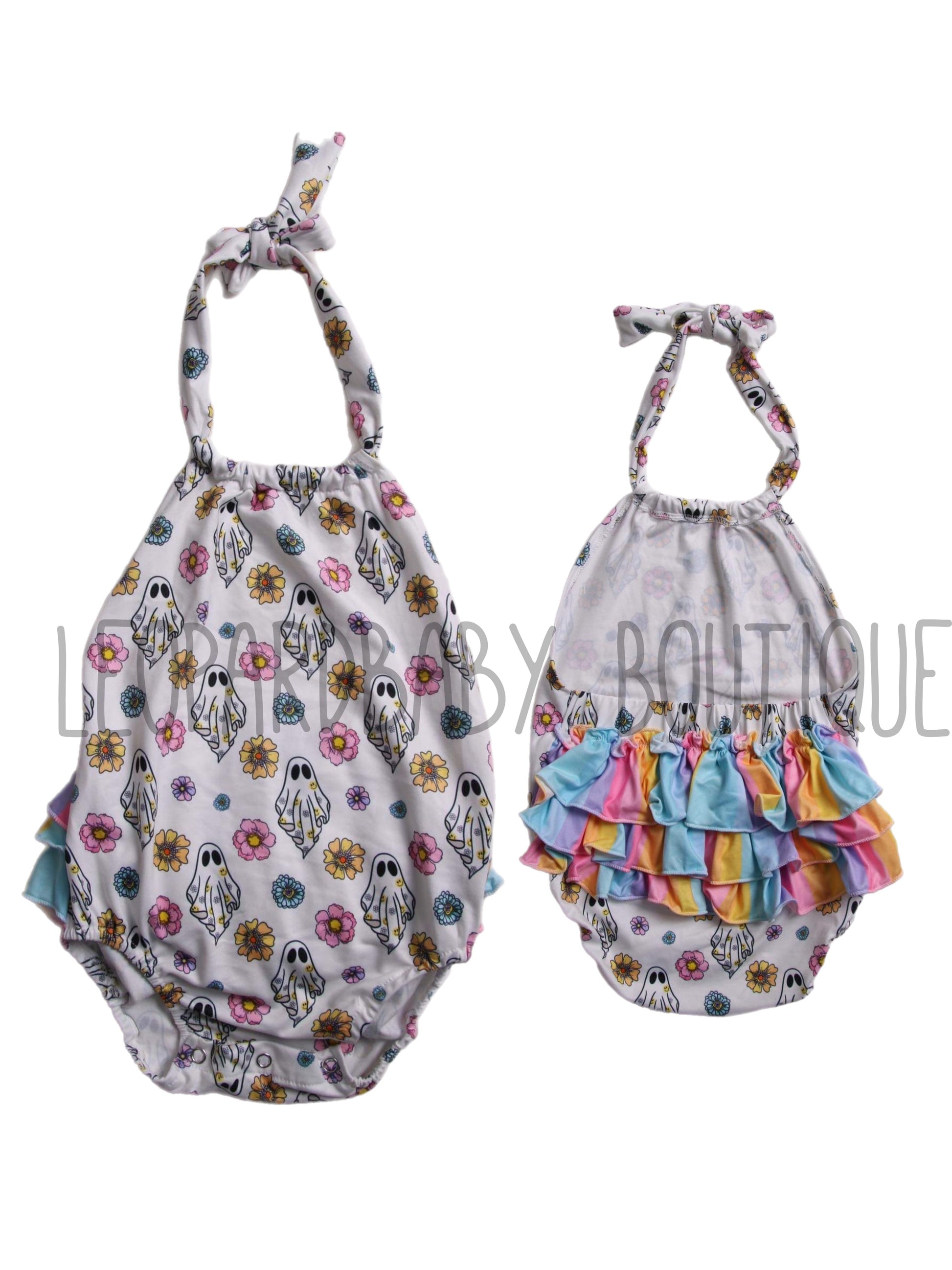 Colorful ghost tie ruffle romper
