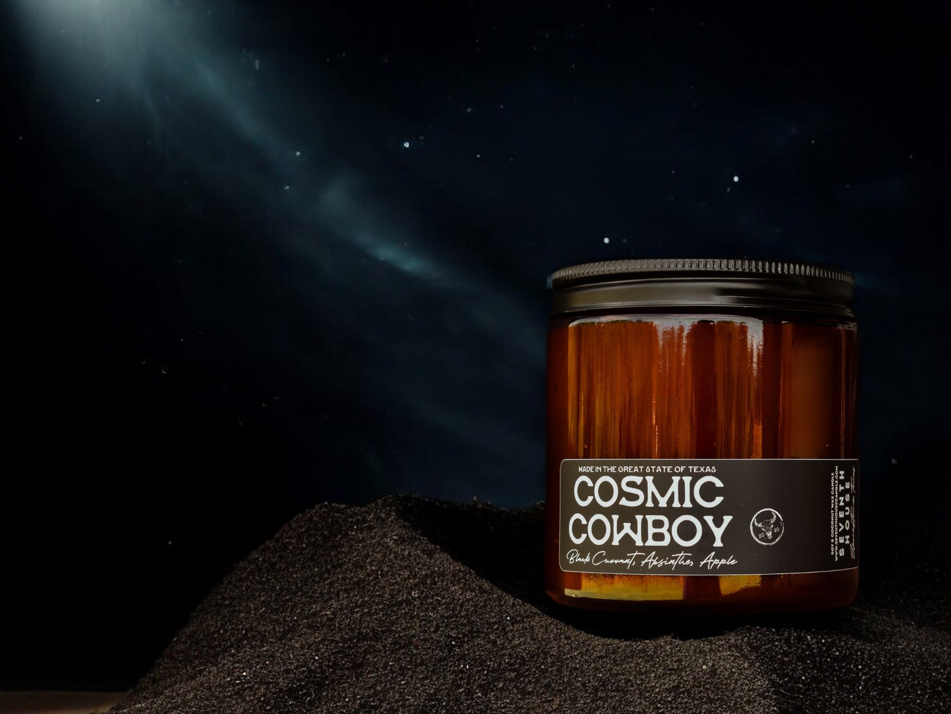 Our "Cosmic Cowboy" scent is a captivating and sensual fragrance. It begins with light traces of apple and delicate saffron threads. Luscious black currants and blackberries are the core of this fragrance. Warm base notes of anise and amber surround you in this sophisticated cocktail of a scent. Patchouli and cedarwood essential oils enhance the intensity of the dark fruit in this rich candle.