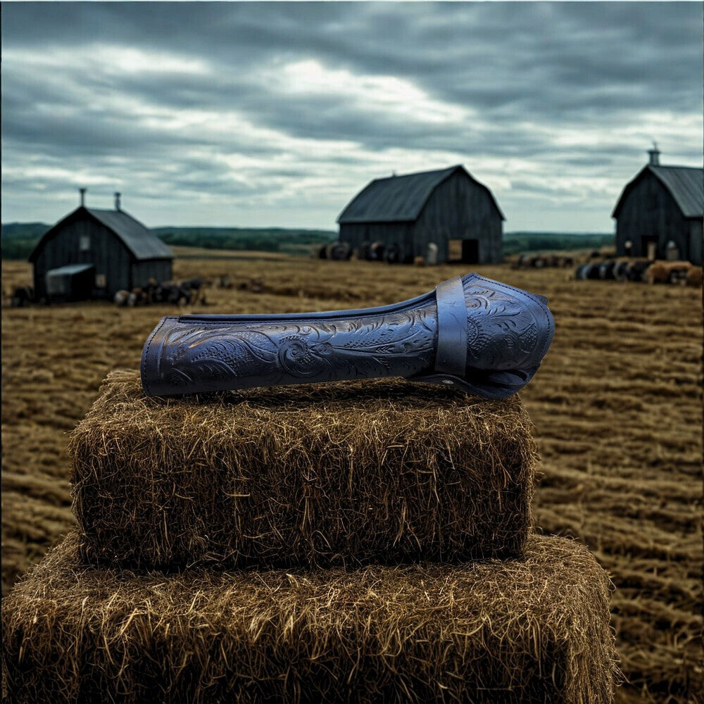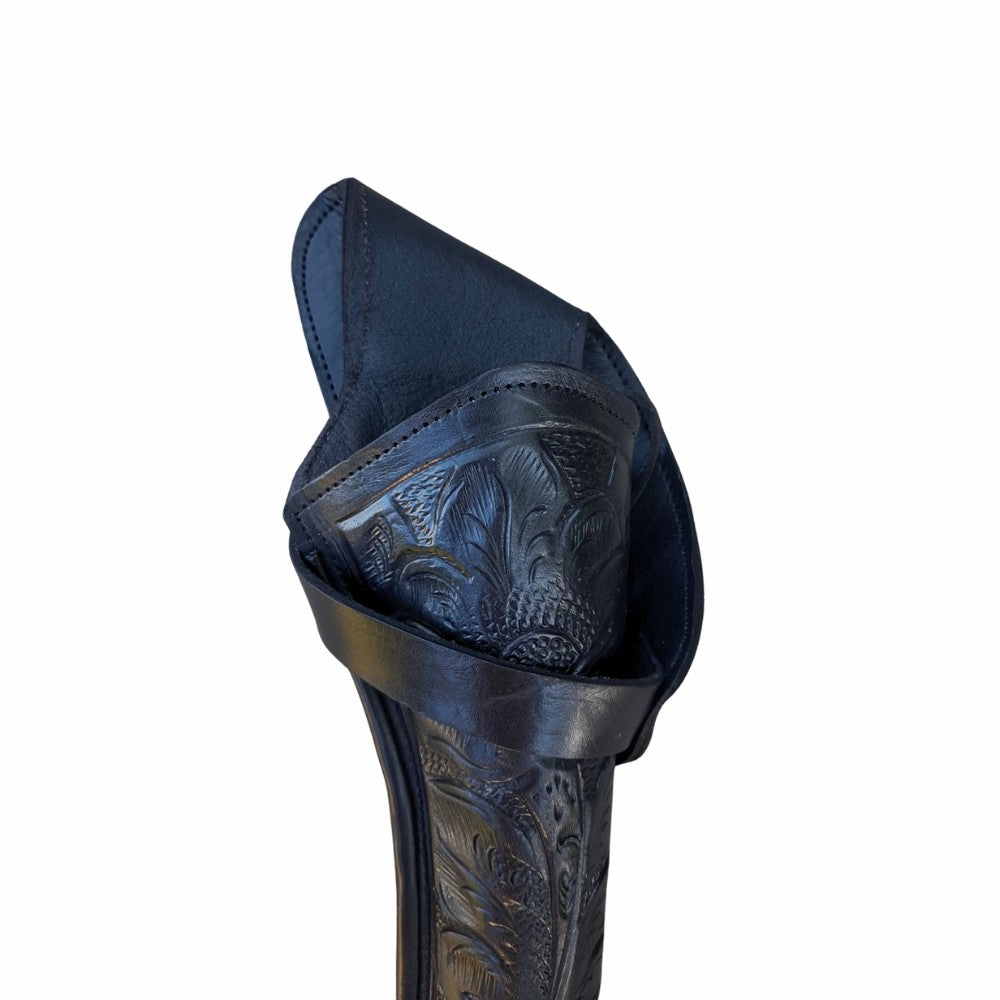 - Made of thick, durable leather with beautiful western style tooling designs throughout on the black version or plain and smooth for the brown cowhide.