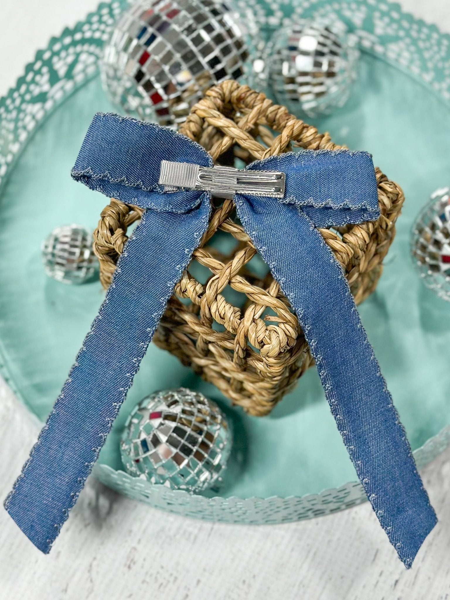 Add some denim delight to your hair game with this ruffle edge ribbon hair bow. Perfect for any casual or dressy occasion, this bow adds a playful touch to any outfit. Upgrade your hair accessories with this quirky and fun piece!