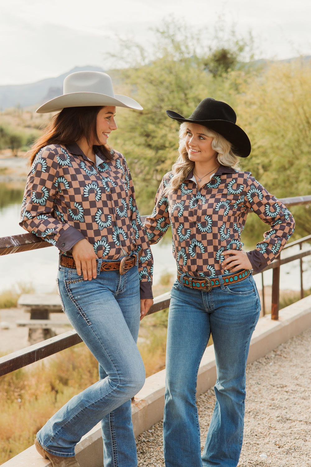 Love neutrals but want a little more? Our Difficult & Expensive button down was made for the cowgirl who loves to blend sophistication and fun. A beautiful brown toned checkerboard pattern sets the stage for the squash blossom najas to pop. Finished out with a brown collar and cuffs, this button down is anything but boring.