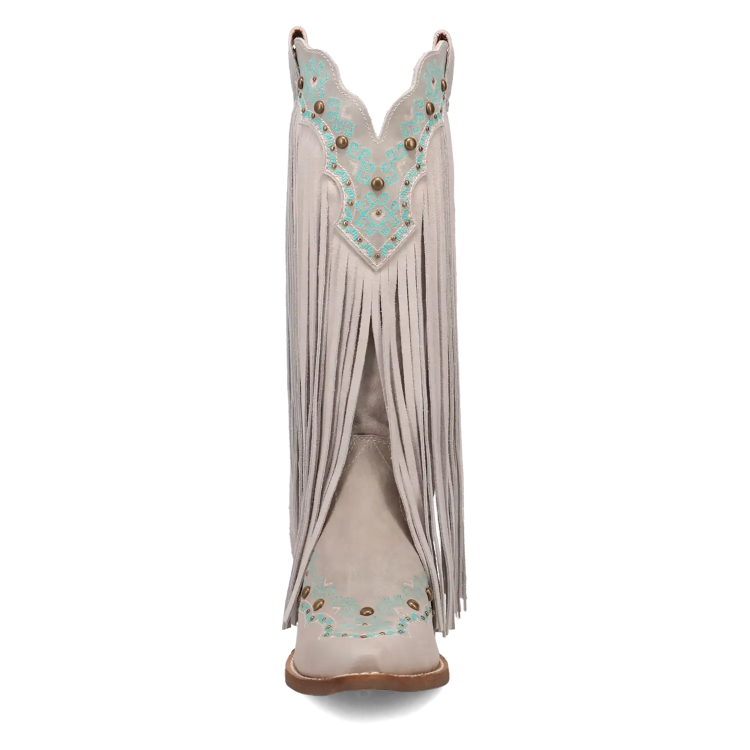 Make a bold entrance wherever you go with the Dingo Tequila Sunrise boots—designed for women who love to stand out with confidence. Made from rich suede leather, these boots feature cascading fringe that flows with every step, giving you a free-spirited, eye-catching look. The exquisite turquoise embroidery along the top of the shaft and toe adds a striking pop of color, while the studded details bring a touch of edgy glam. Available in various colors, you can find the perfect pair to match your unique style.