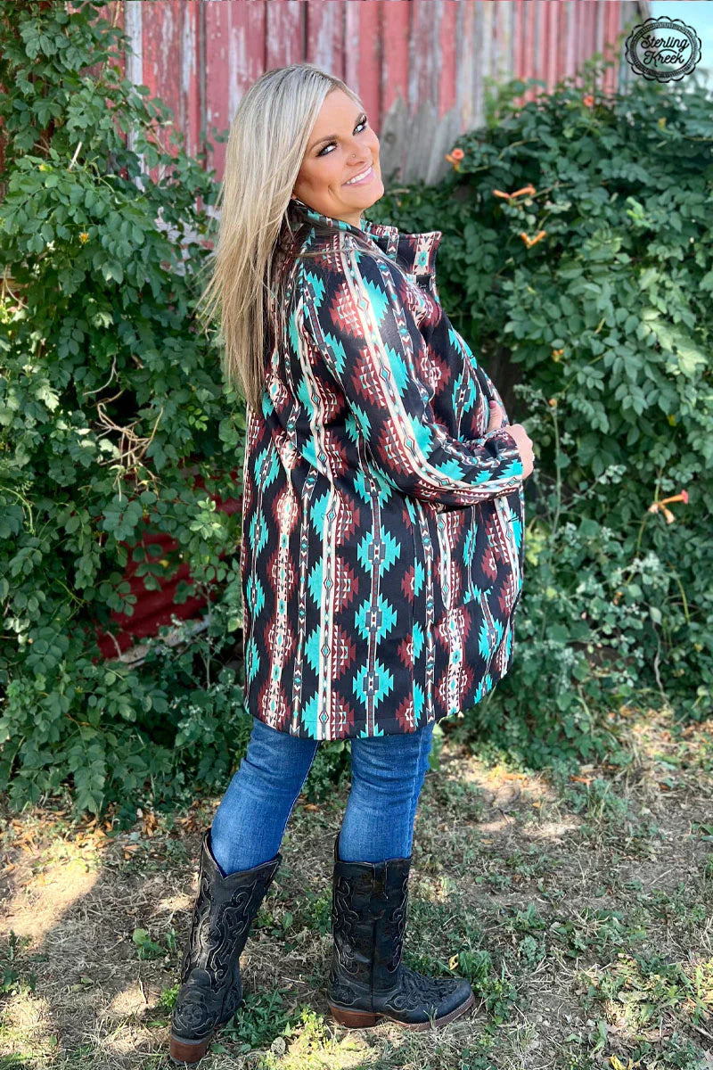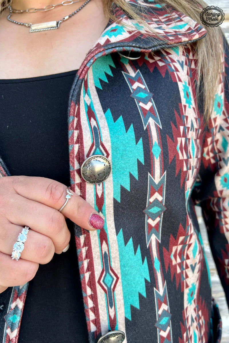 Ready to take your style up a notch? Look no further than the Durango Kreek Jacket! This eye-catching Aztec-patterned jacket features vibrant turquoise, marron, and cream colors and is finished with authentic Buffalo-nickel buttons. Put some spice in your wardrobe!