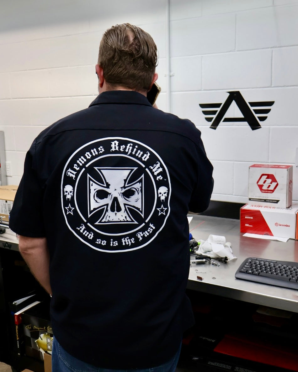 Heavy Duty Mechanic’s Shirt. Embroidered Chest and Sleeve, and Screen Printed Back.