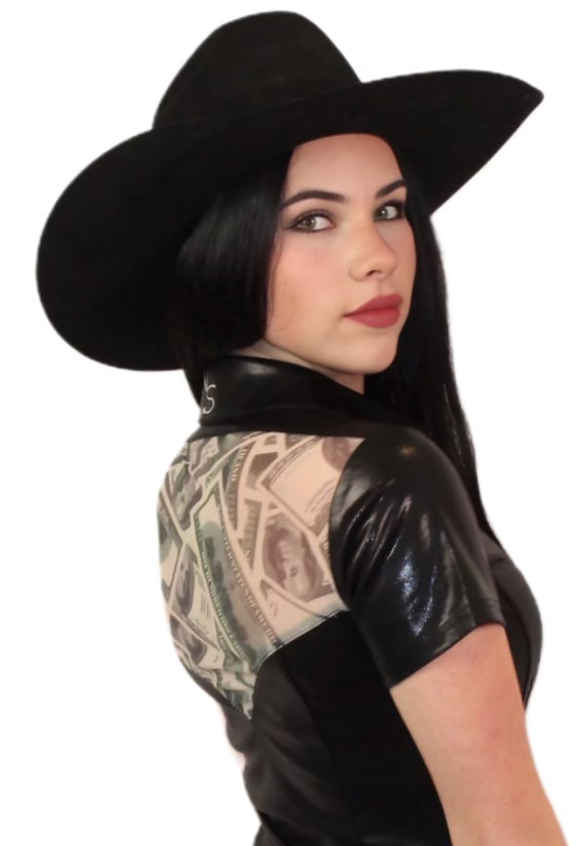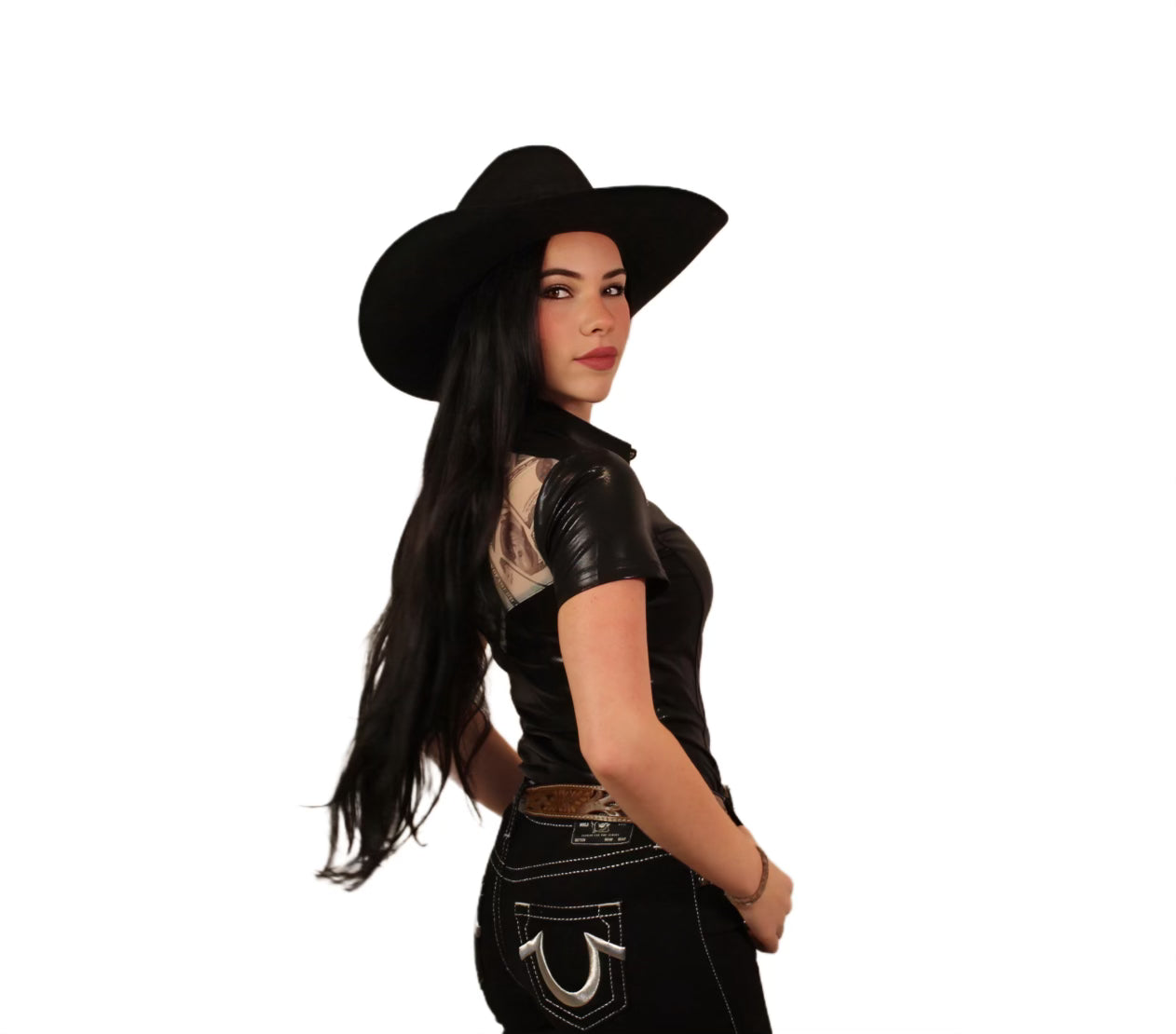 Roll up to the jackpot lookin’ like a whole stack of winnings in the Entry Fees Jackpot Shirt. Built for barrel racers who ride fast and dress sharp, this short sleeve number ain’t your average tee. She’s cut from a slick metallic black 4-way stretch spandex/poly blend that shines like a fresh payout under the arena lights, and she’s got just the right amount of stretch to move with you when you’re haulin' tail around them barrels.