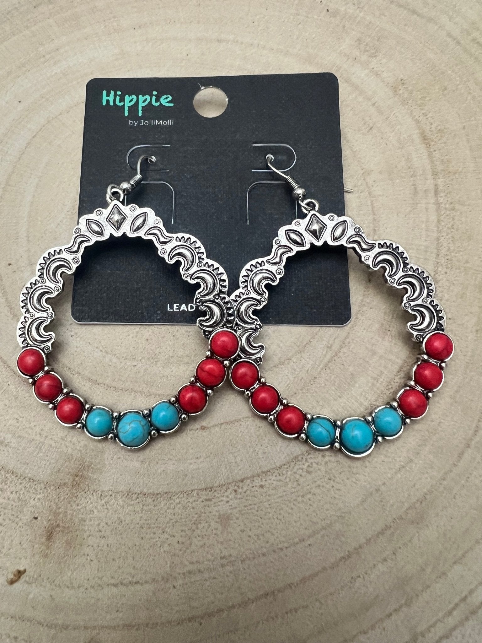 Faux Turquoise and Coral Hoop Earring - 1 3/4 inch drop