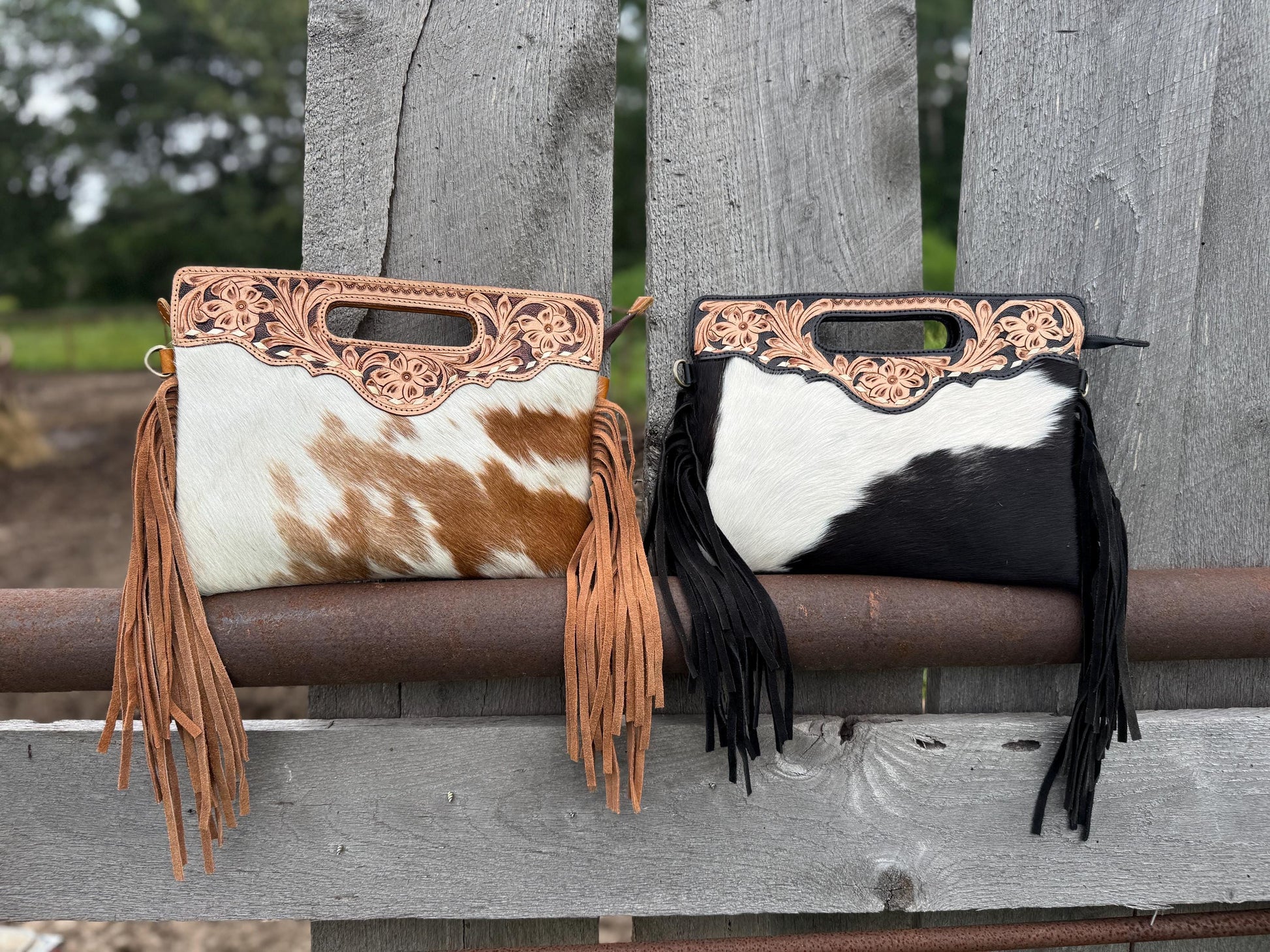 Features: Genuine Leather, Tooled flora details, Buckstitch details, Zipper top closure, Shoulder strap, 10" fringe, inner zipper pocket, fully lined, cowhide on both sides, one back zipper pocket.