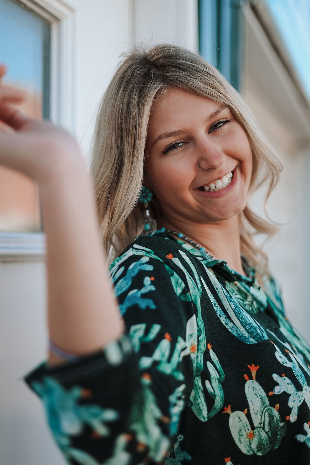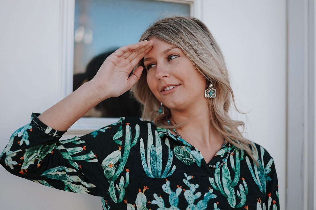 Cactus Print bulgari fabric with a collar; loose fit top with 3/4 sleeves. Made with fabric that does not cling or wrinkle.
