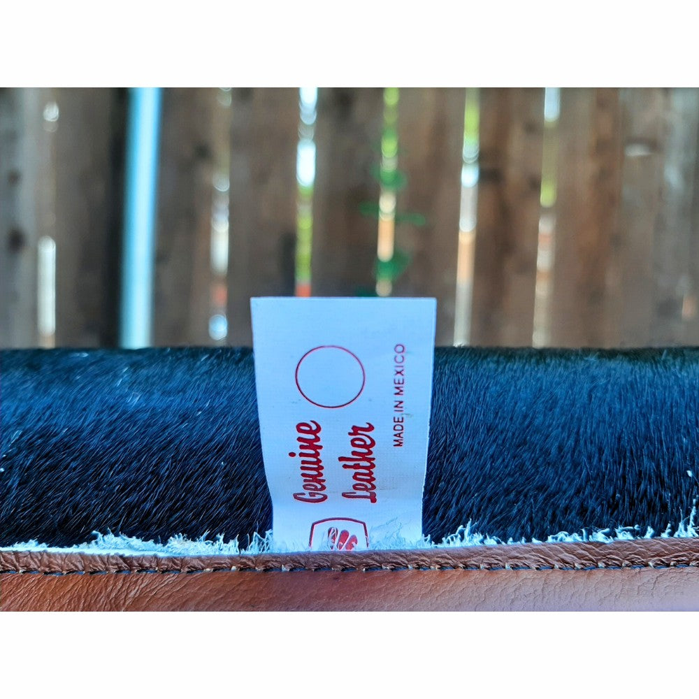 - Genuine hair-on cowhide (black, medium or dark speckled)