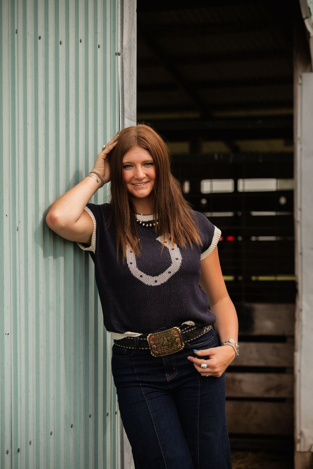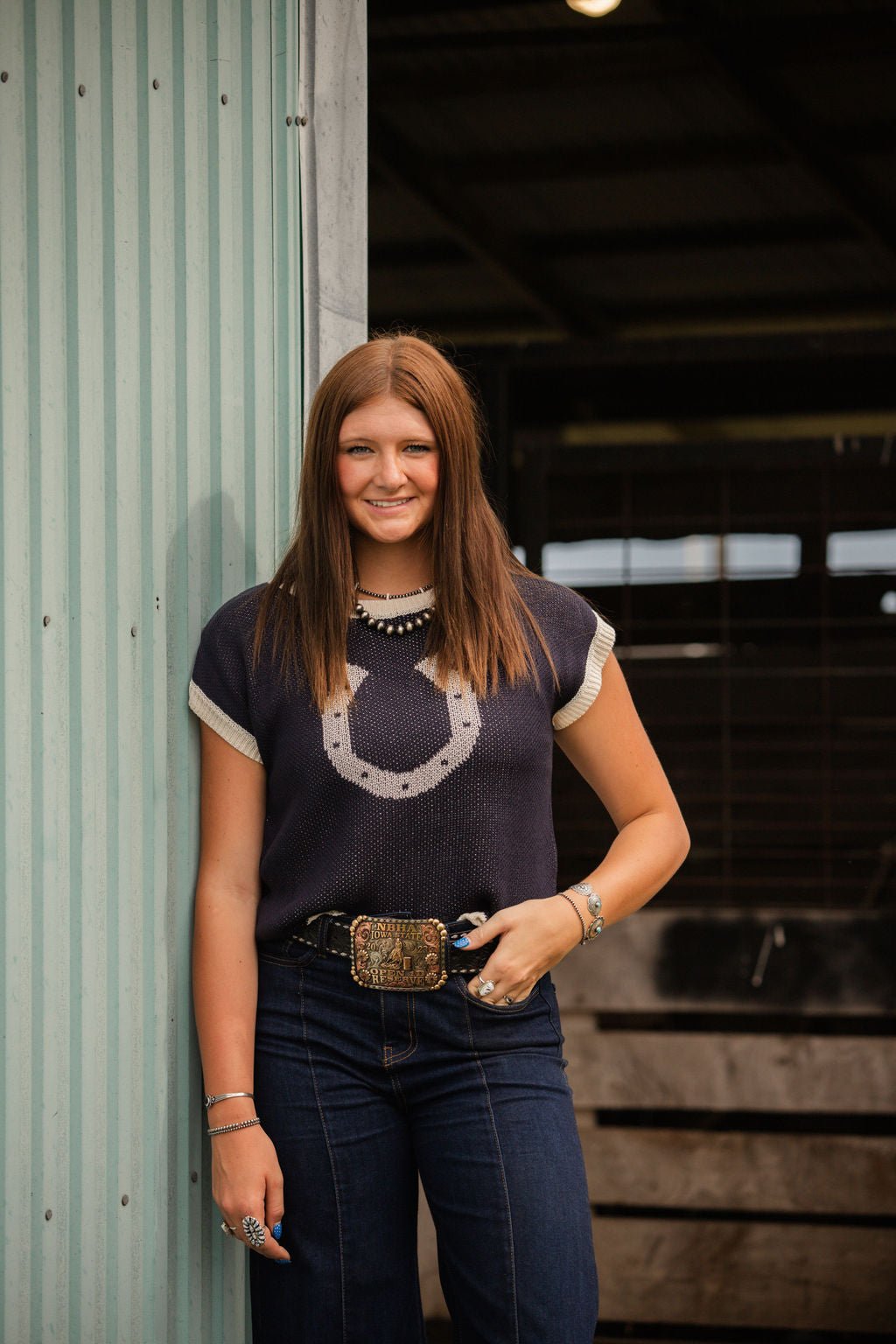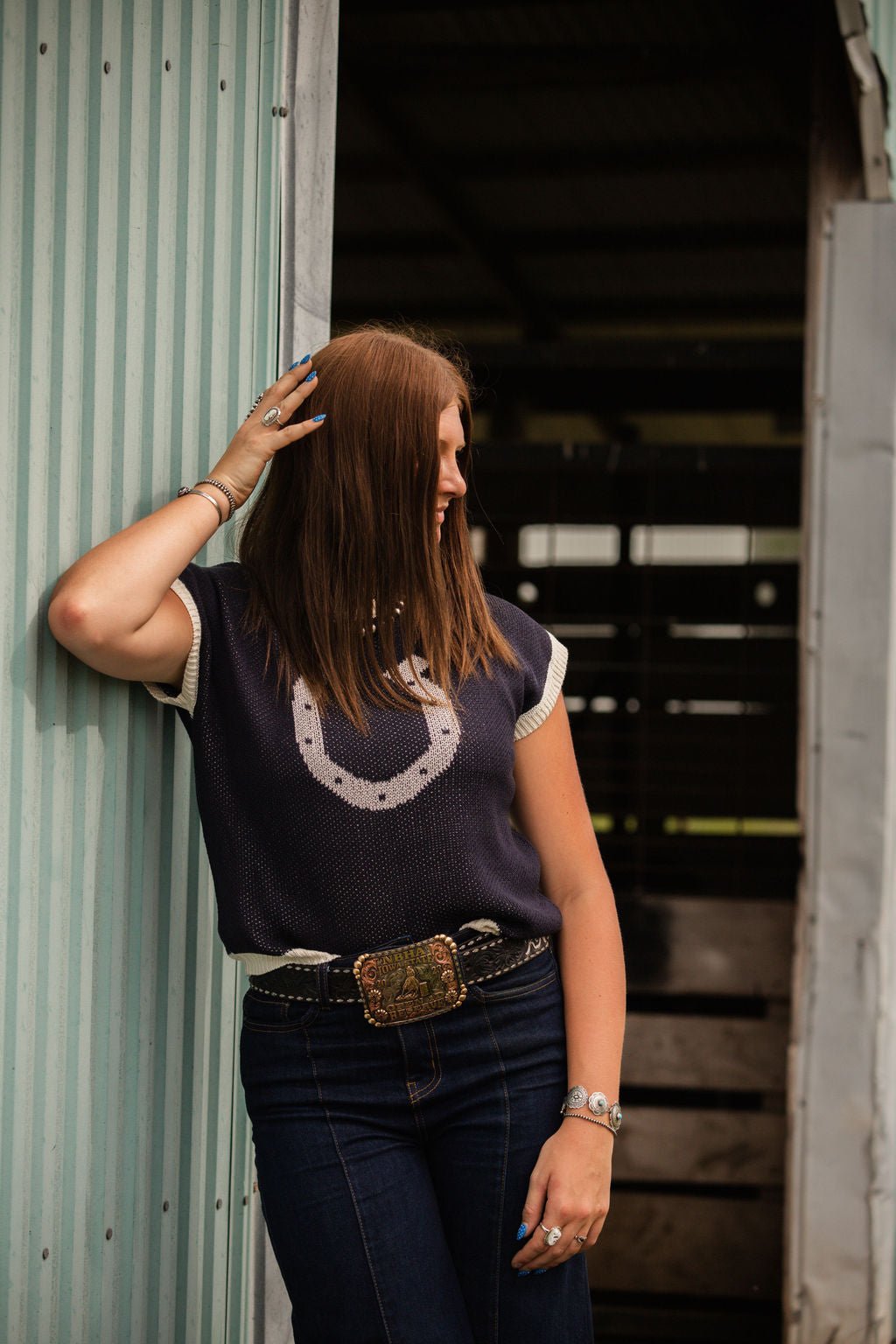 This Horseshoe Short Sleeve Knit Sweater features a round neckline and relaxed fit with drop shoulders for easy wear. The distinctive horseshoe jacquard pattern and contrast trim add a classic Western touch. Made from 100% acrylic, this knit pullover is lightweight and comfortable without lining.