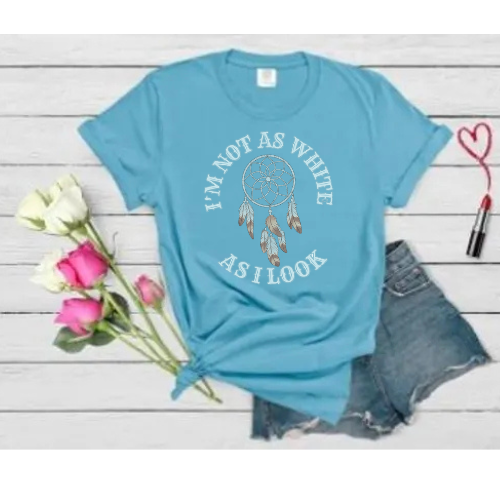 A statement piece with spirit. This tee carries a bold dreamcatcher graphic and a message that hits with humor, heritage, and heart. Available in grey, turquoise, and baby blue, it’s the perfect blend of soft tones and strong identity. Wear it loud, wear it proud, and let ’em know there’s more to you than meets the eye.