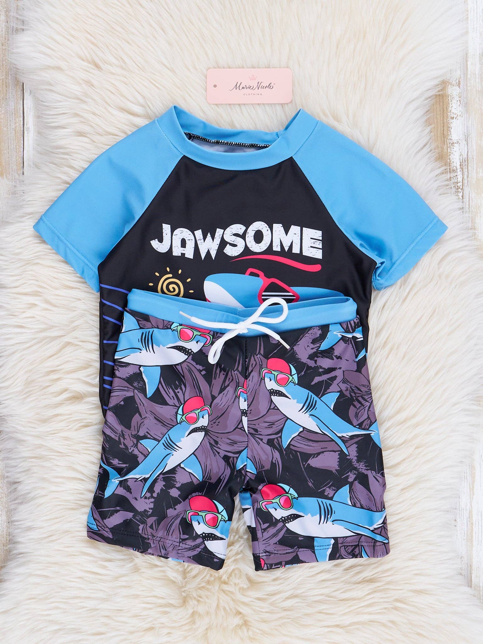 Introducing the "Jaw-some" Raglan Rash Guard Swimsuit – the perfect pool party look for kids! This fun, on-trend outfit features a comfy rash guard top with a "jawsome" graphic and coordinating swim trunks with an elastic waistband. Cool and protected – no worries, just smiles! * Fully lined. * Top: 82% Polyester / 18% Spandex * Bottoms: 82% Polyester / 18% Spandex * Fits true to size.