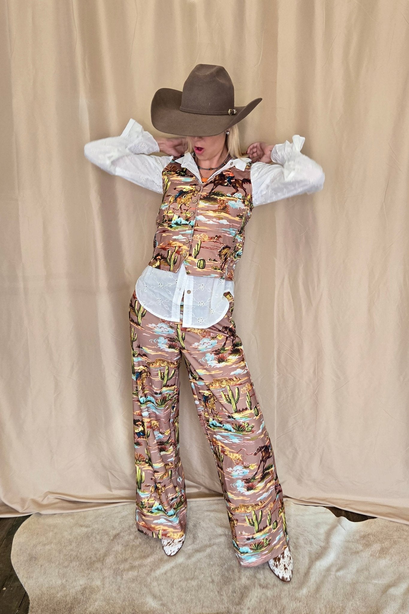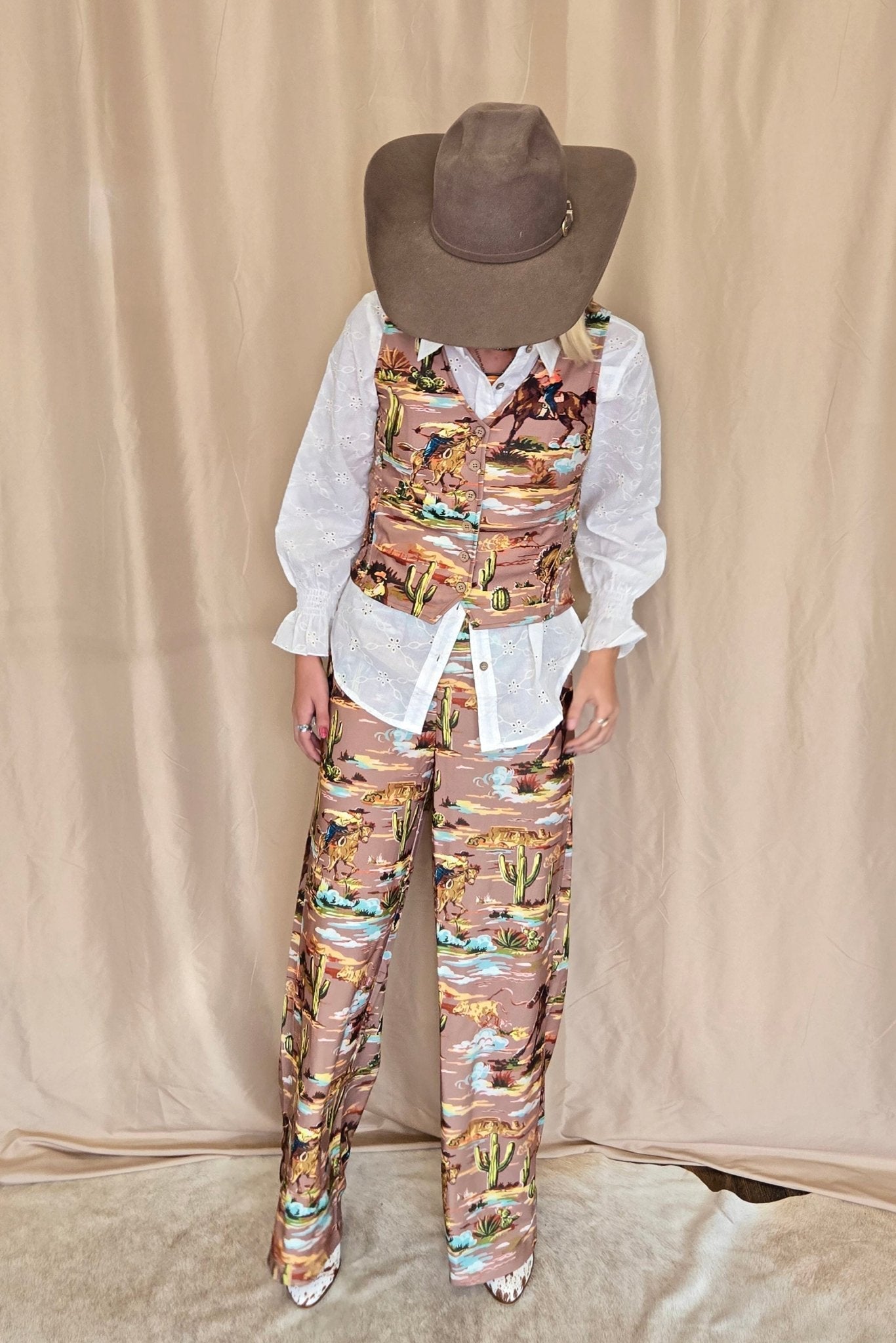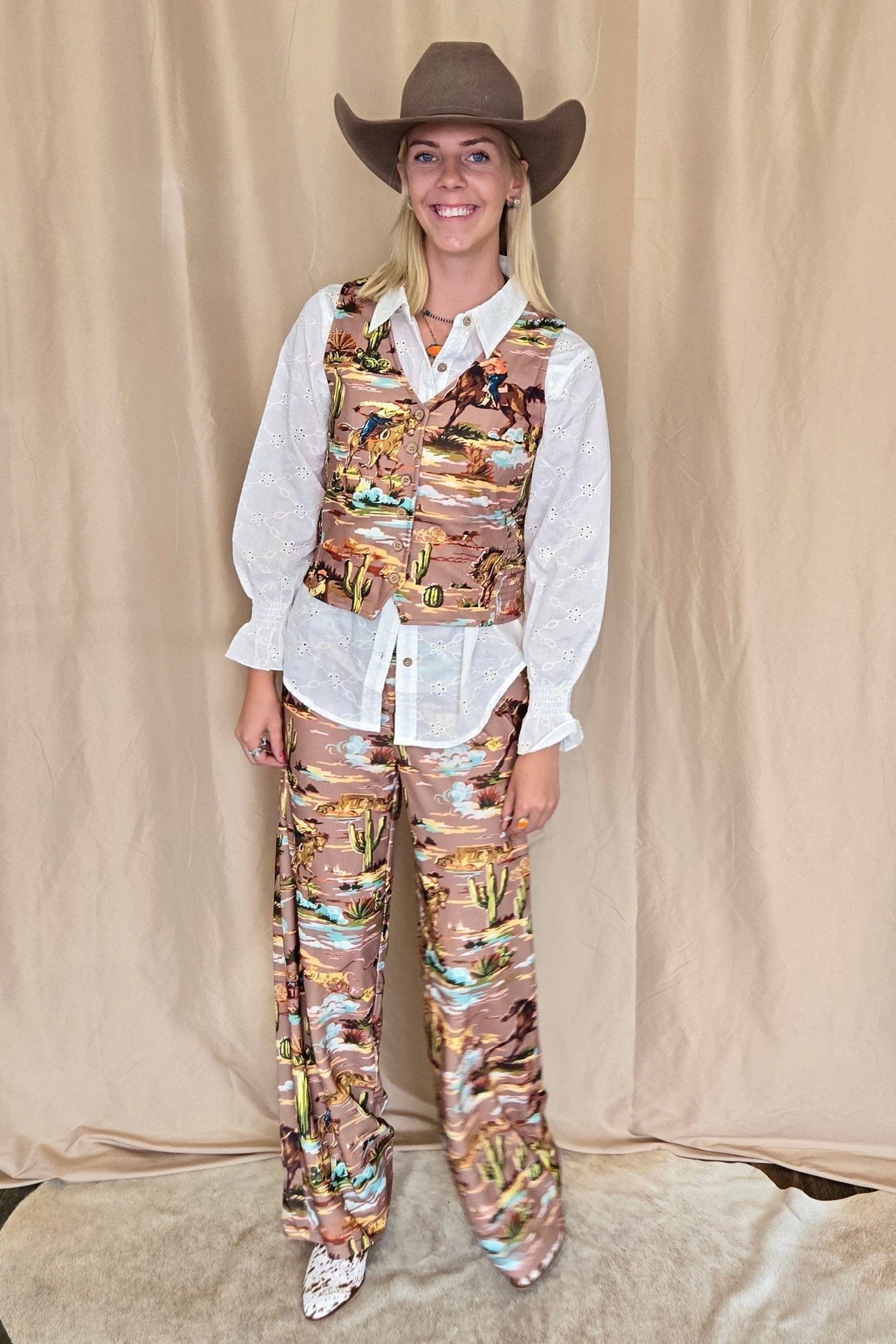 This standout vest showcases a charming vintage cowboy print and blends comfort with style through its smocked side panels for a flattering fit. Equipped with sturdy wooden buttons, it adds durability and a rustic touch. The smocked sides ensure a fitted yet comfortable wear, perfect for any Western look.