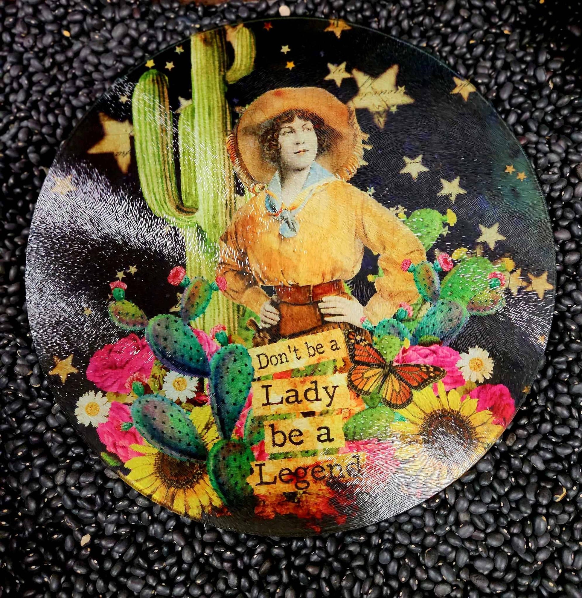 Never settle for being ordinary when you can be legendary! With this Round Glass Cutting Board/Charcuterie/Trivet, you can truly "Be a Legend" with a stylish western cowgirl accent. Keep your counters safe while serving up some country style with this multifunctional kitchen accessory. Yee-haw! These come in 2 sizes...12"& 8"