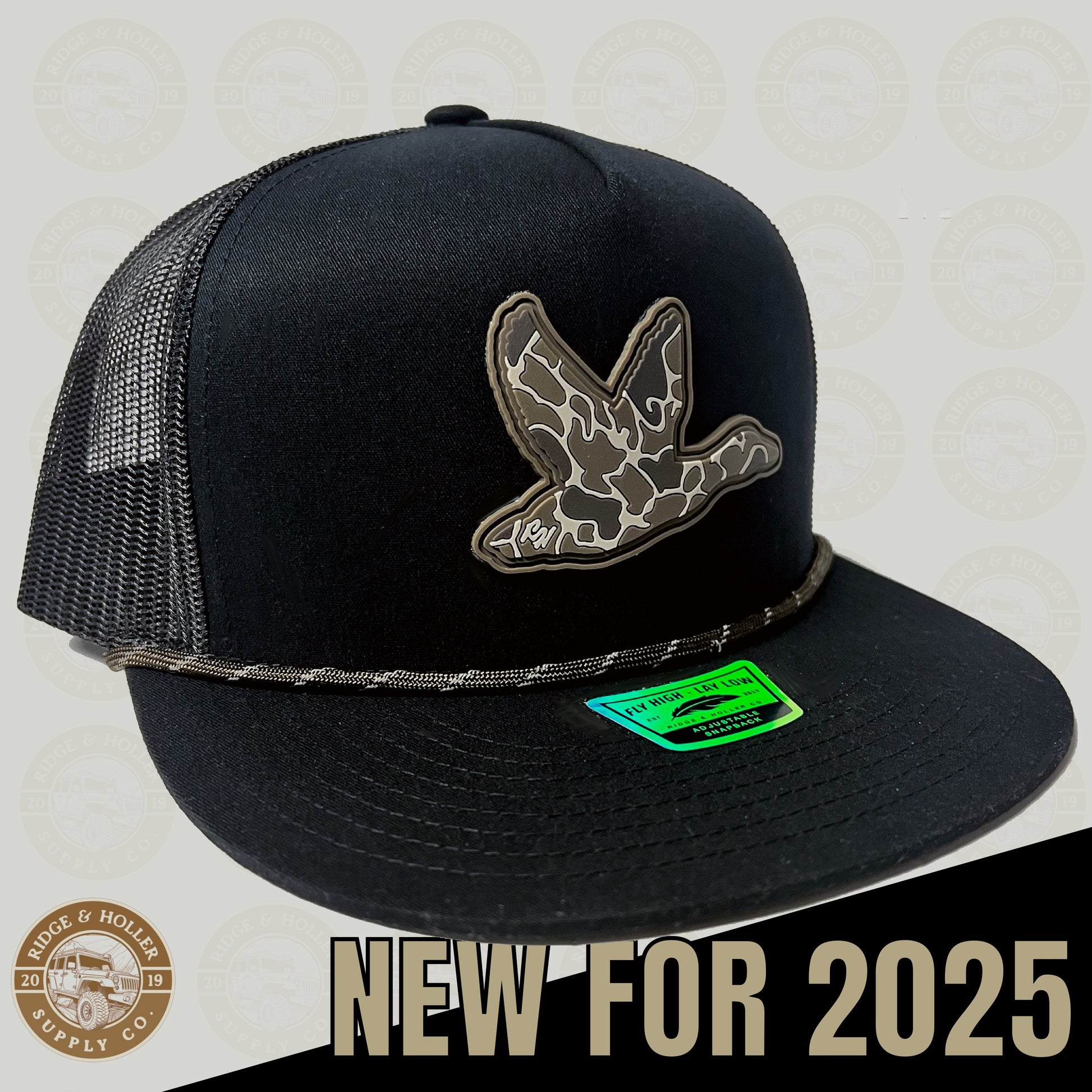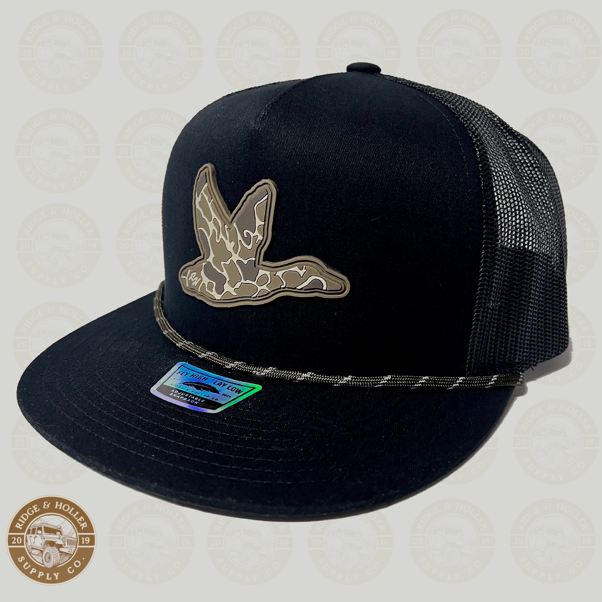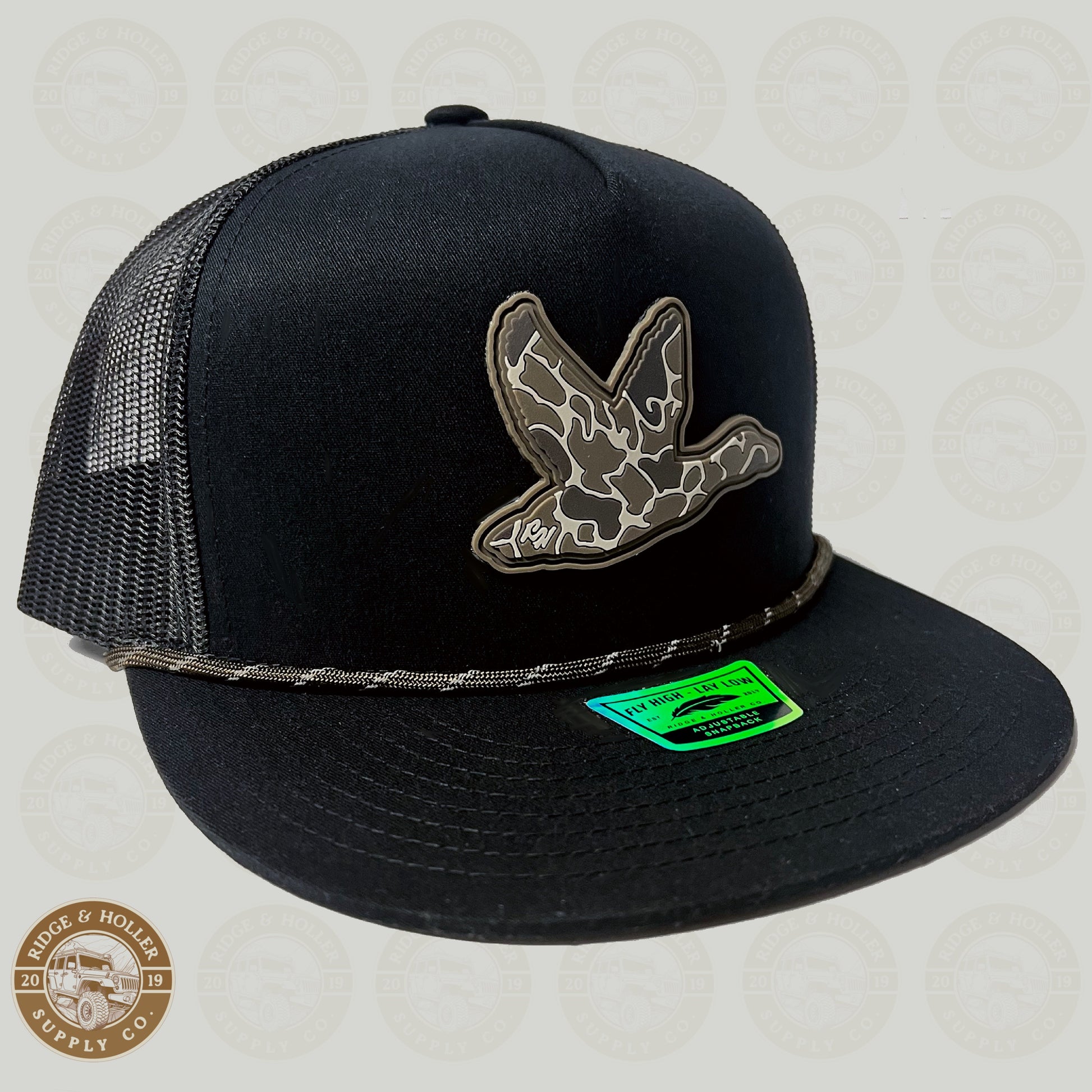 Meet the newest member of the Ridge&Holler family. Marshland in a new color way, the now all new shadow moss marshland is available on an all black tall boy snap back hat. Blend in with the environment in style – a camouflage design that strikes the perfect balance between fashion and functionality. Fly high and lay low.
