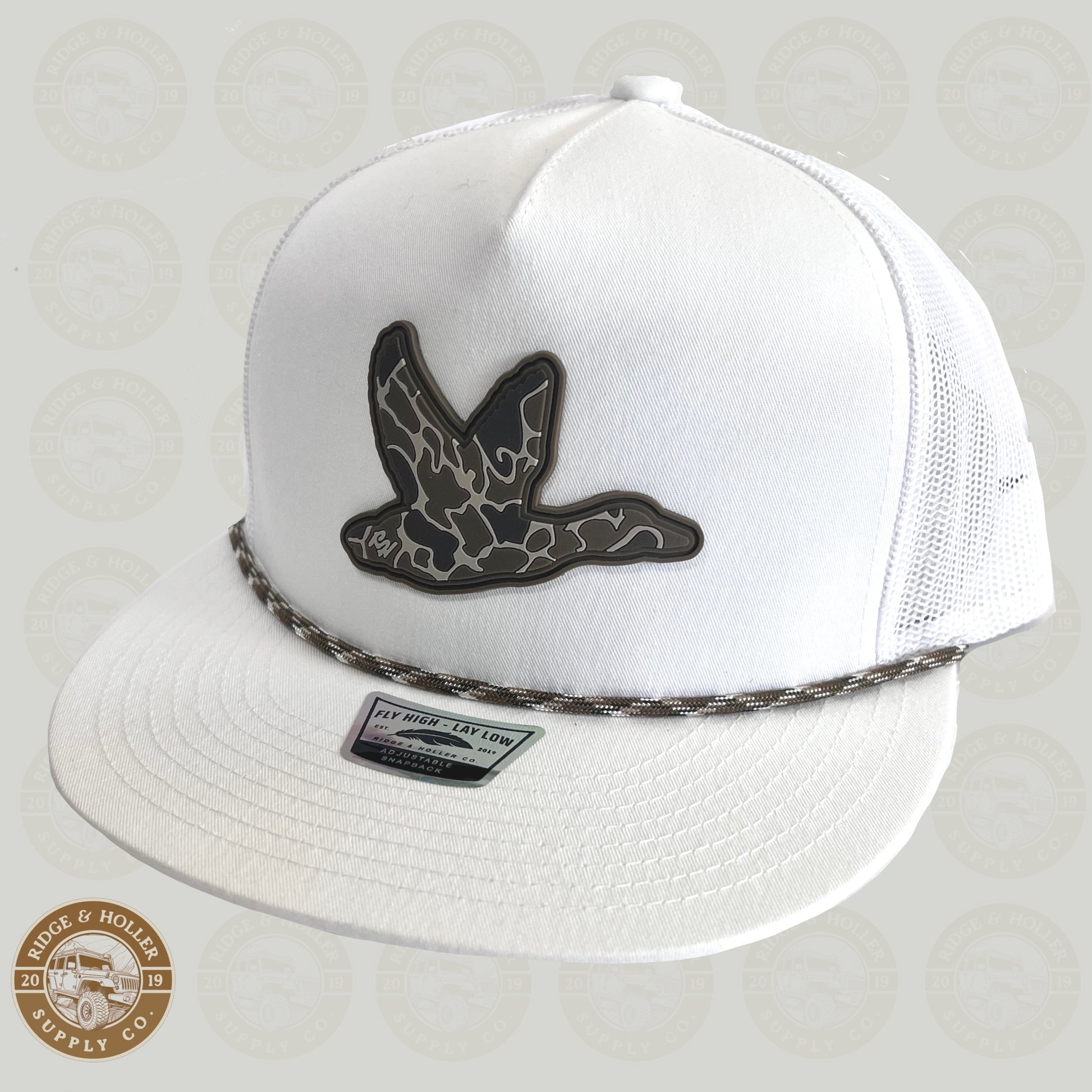 Meet the newest member of the Ridge&Holler family. Marshland in a new color way, the now all new shadow moss marshland is available on an all whire tall boy snap back hat. Blend in with the environment in style – a camouflage design that strikes the perfect balance between fashion and functionality. Fly high and lay low.