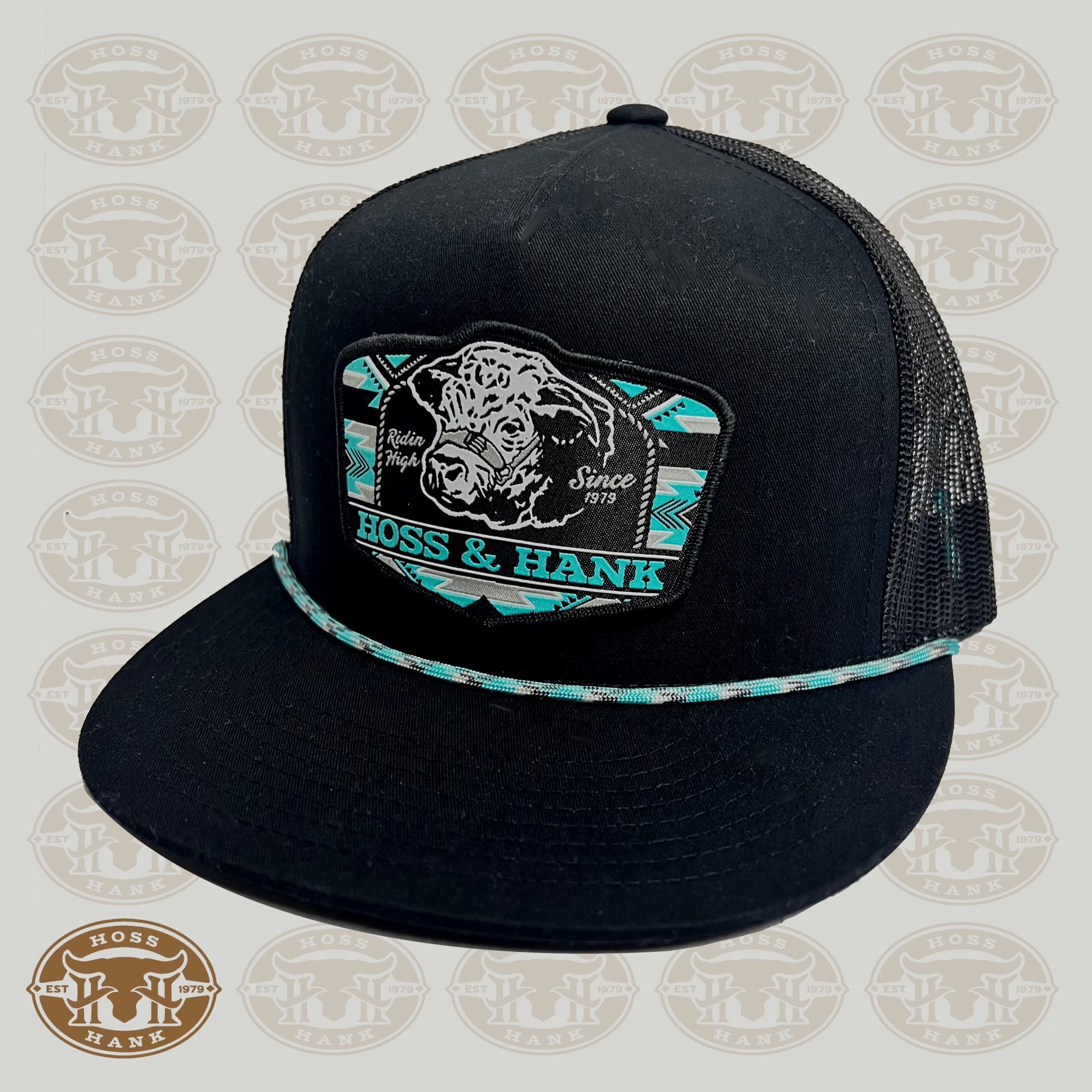This tall boy SnapBack is designed in all black with a touch of turquoise with a stylish rope detail and features the Hoss&Hank outlawfitters logo. Expertly crafted and designed with a stylish rope detail. Perfect for everyday wear or as a unique addition to your hat collection.