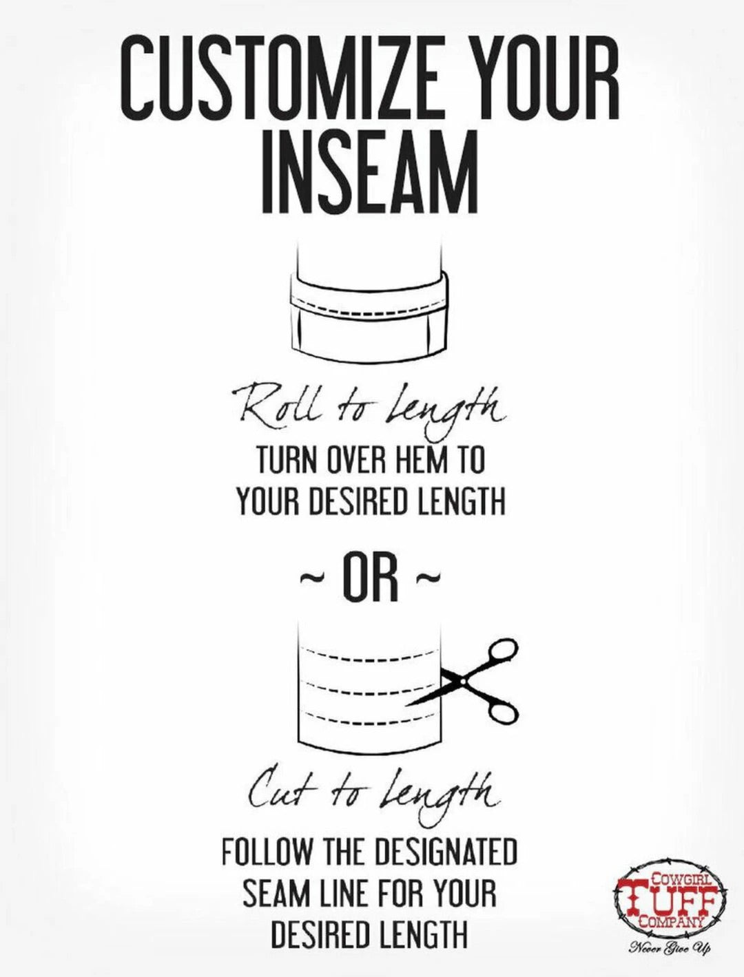 Cut to length inseam. They come in a 37’ length with pre-cut stitching lines that you cut with a sharp scissors at the 35, 33 or 31 lengths. Yes, they will wash up great because microfiber does not fray. So, Work Hard in them or Play Hard in them.