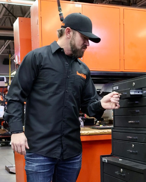 Men's Long Sleeve Black Embroidered Shop Shirt - Orange Logo