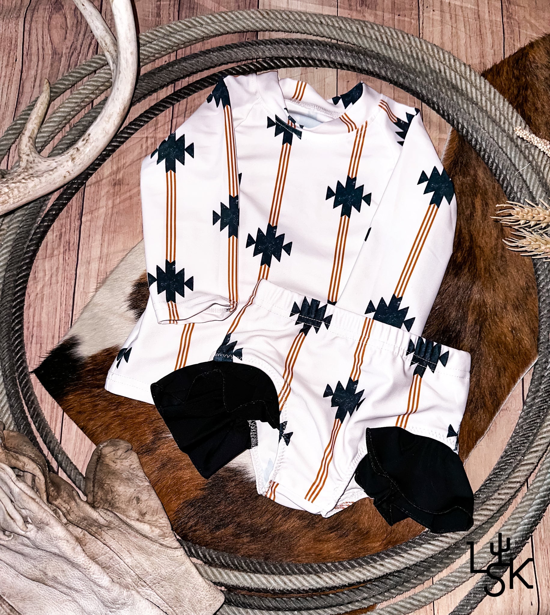 This adorable two piece is perfect for your little cowgirl! With a lined front, ruffle bottoms, and a sun blocker shirt, this is the ultimate western bathing suit. It runs true to size, but if you're in between sizes, I suggest sizing up for the perfect fit.