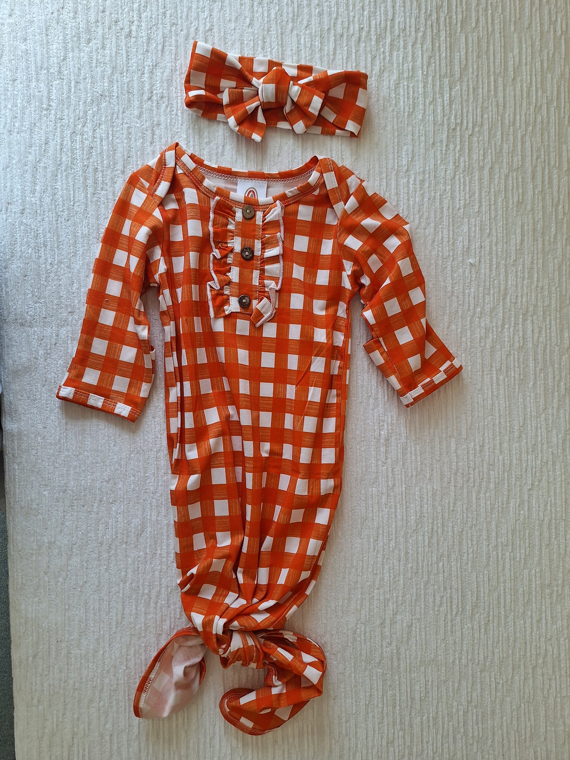 Bamboo material with an adorable knotted bottom, foldable sleeves, and button bow front detail. Headband included!