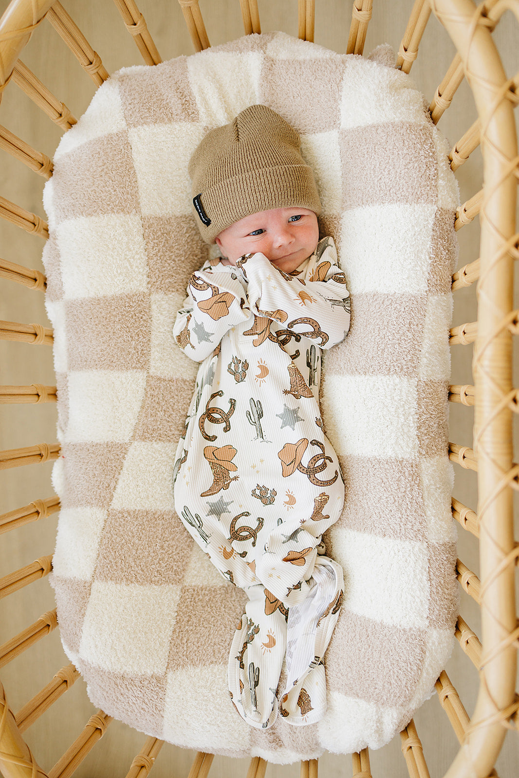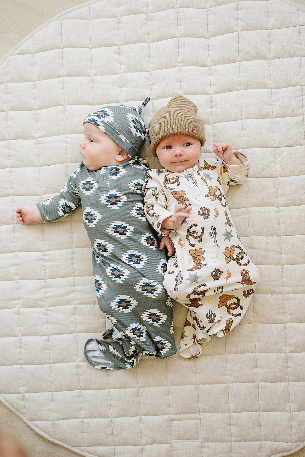 These gowns are size 0-3. They are made out of supremely soft Bamboo Rayon to keep your little one comfortable. We have a variety of gender neutral designs and colors making them perfect for any baby. They have fold over hands and two snaps for easy on and off. We also have shoulder flaps to make it easily pull over your little ones head, we want to make dressing your baby as easy as possible. The bottom is easily tied and untied in a knot for no-fuss diaper changes which makes it a newborn baby essential! These are made out of the same fabric as our stretch swaddles and match the colors of the stretch swaddles, head wraps, and hats.