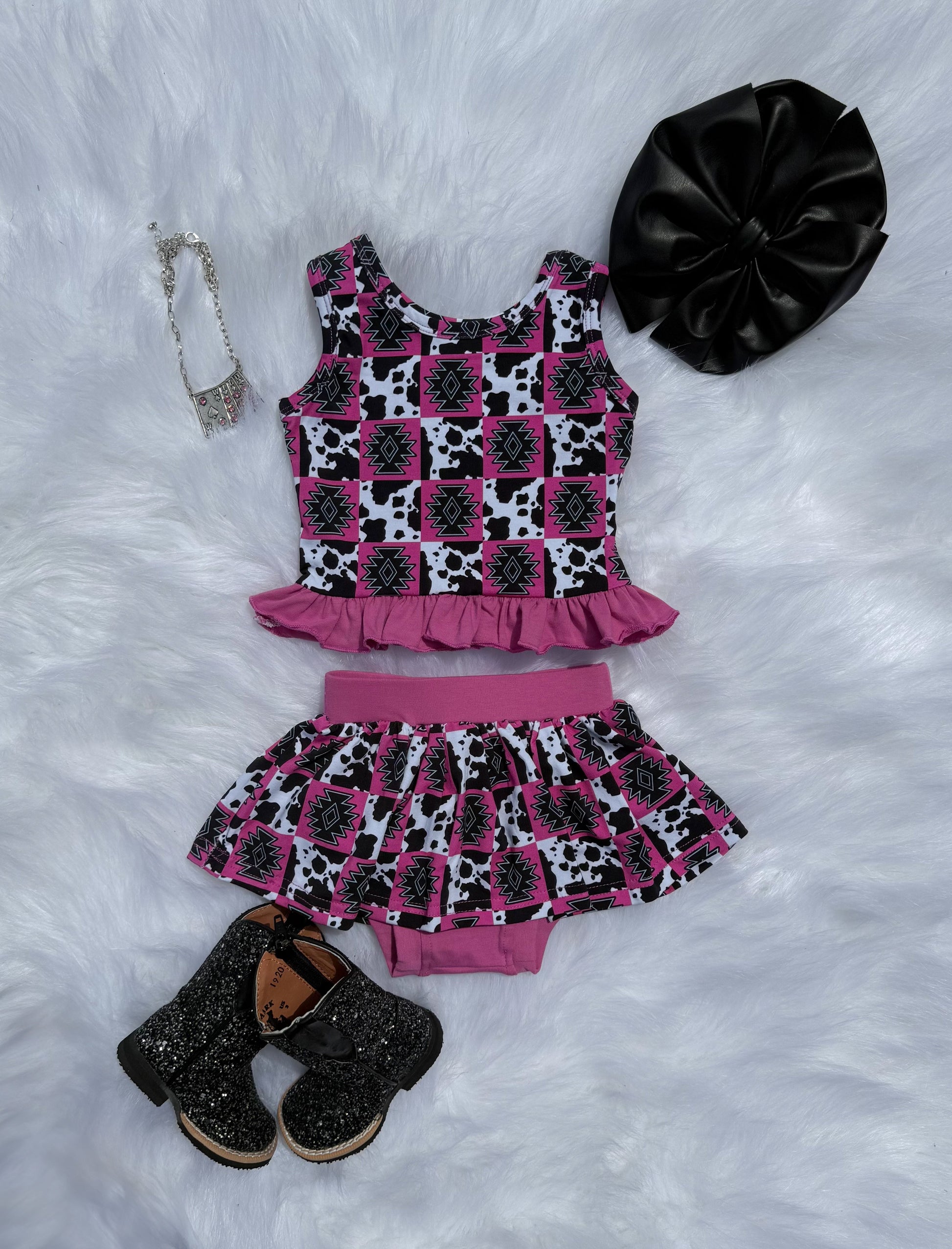 Pink Aztec & Cow Checkered Skirted Ruffle Set (FINAL SALE)