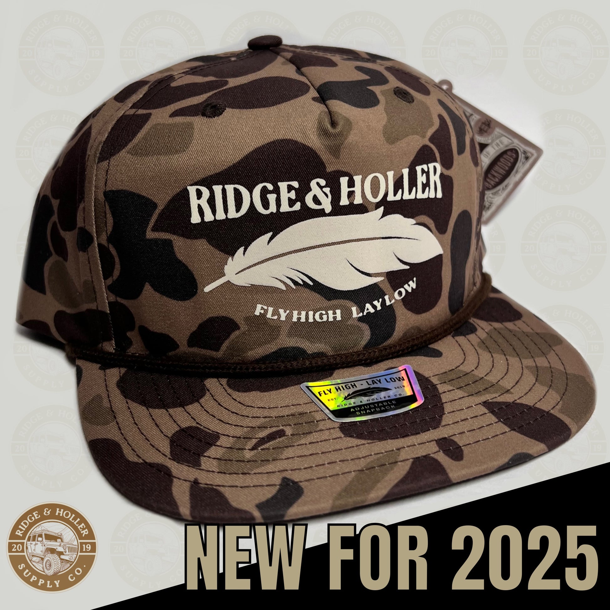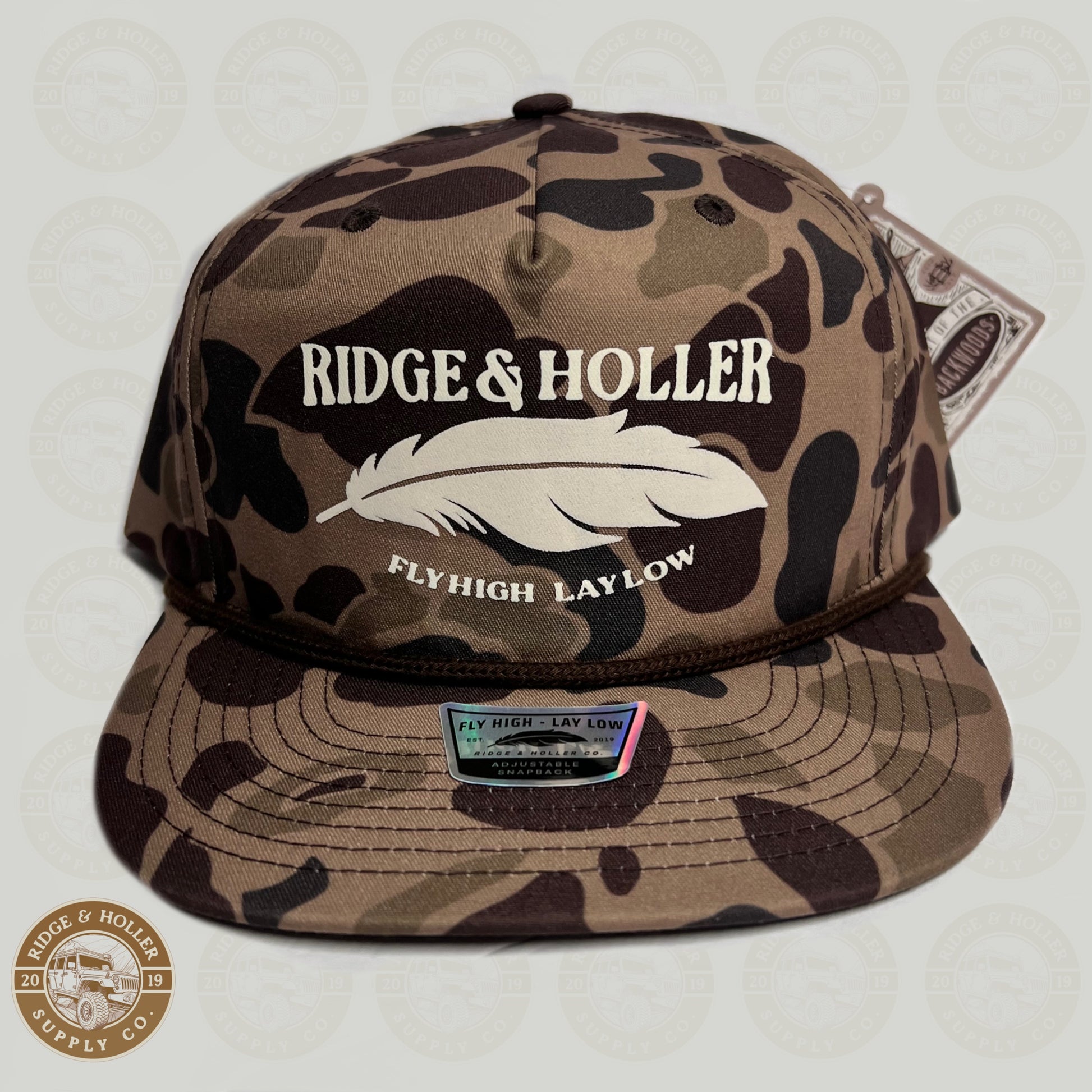 Discover the Pure Quill, the latest addition to the Ridge&Holler lineup! This bark duck camo and brown high crown flat bill SnapBack boasts a feather accent and RH brand, making it a true standout accessory.