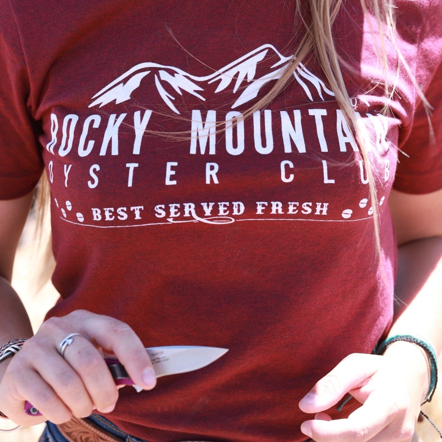 U Spur Rocky Mountain Oyster Club in white screen print on Maroon Bella Canvas crew neck tee. Are you in the Club?!?!
