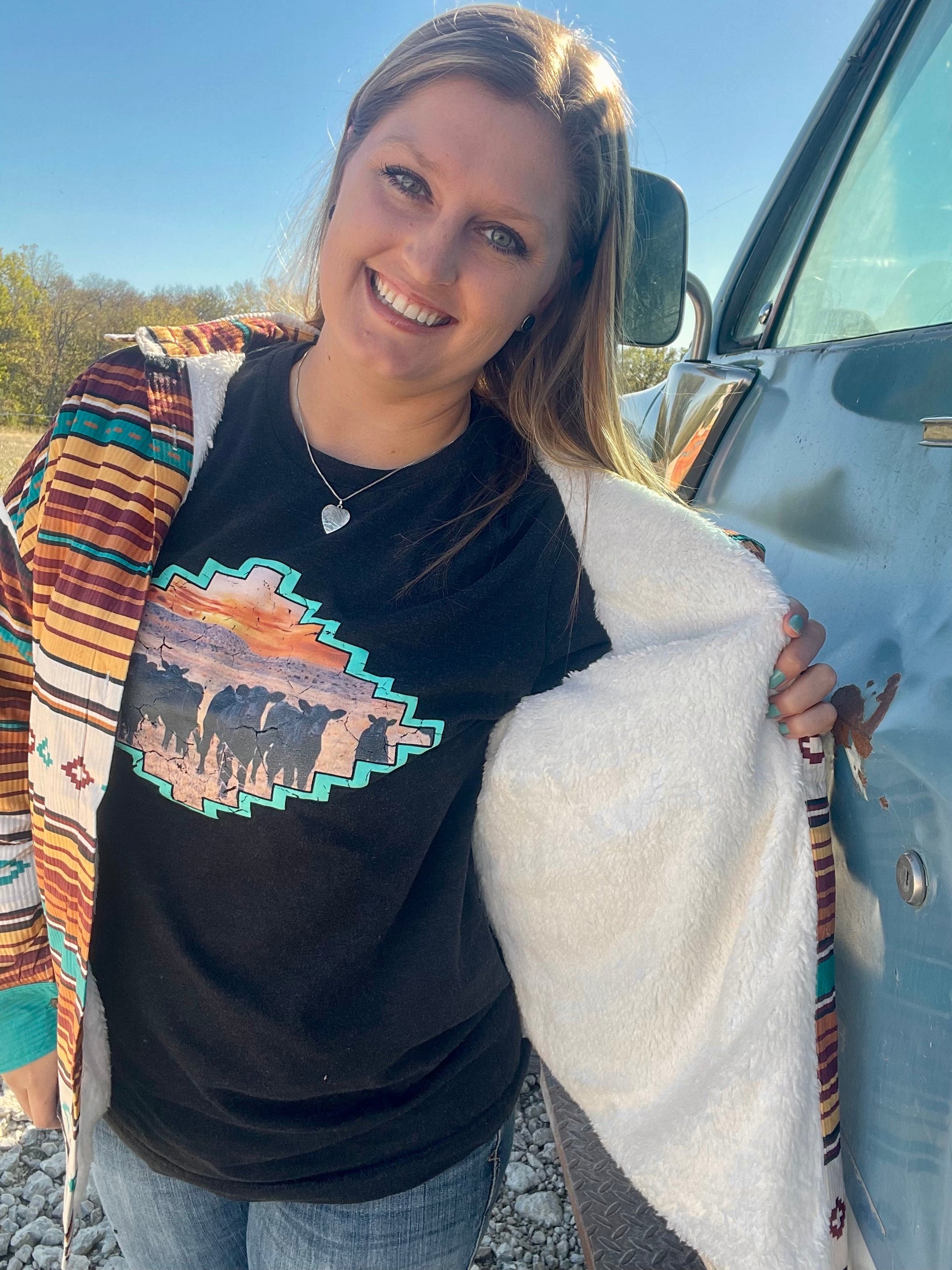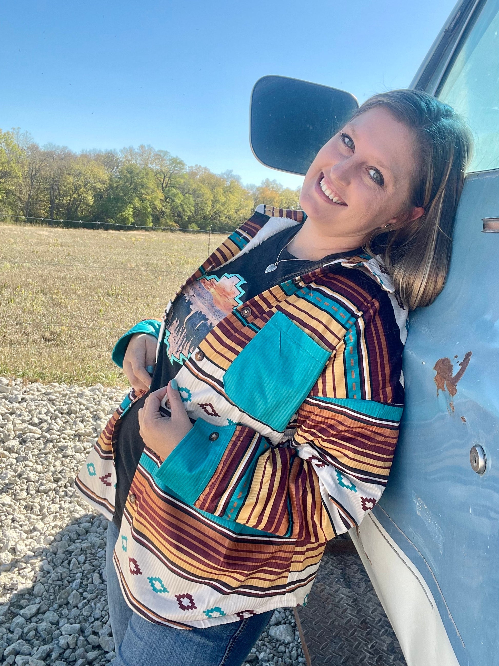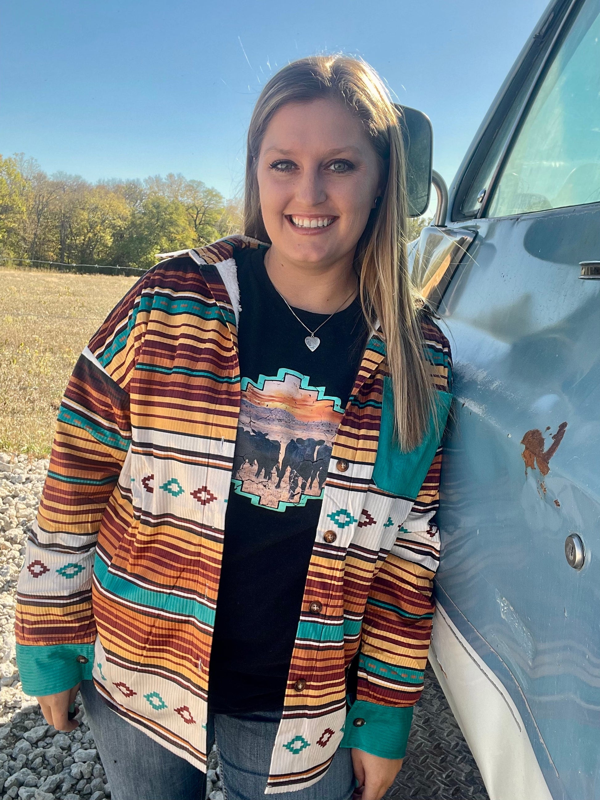 An all-time Dixies Western Wear favorite, the Shiner Jacket is back! With the perfect serape print in browns, creams and turquoise it is definitely beautiful. This jacket fits comfortably and can be worn in multiple ways that best suit your style. Sure to keep you warm with its sherpa lining - you don't want to miss this!