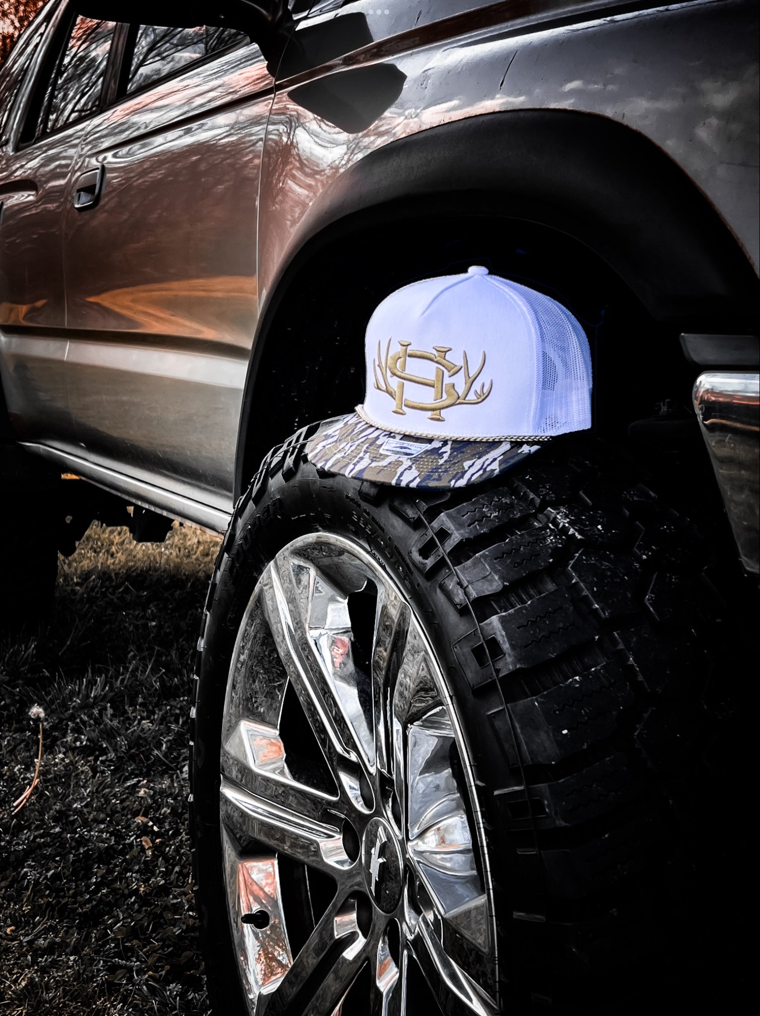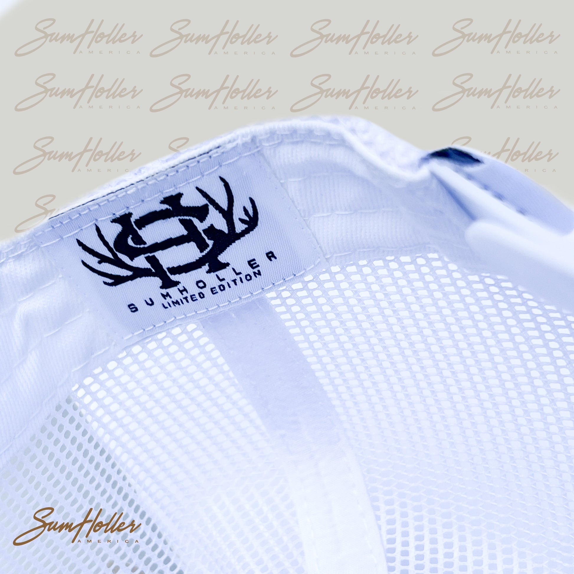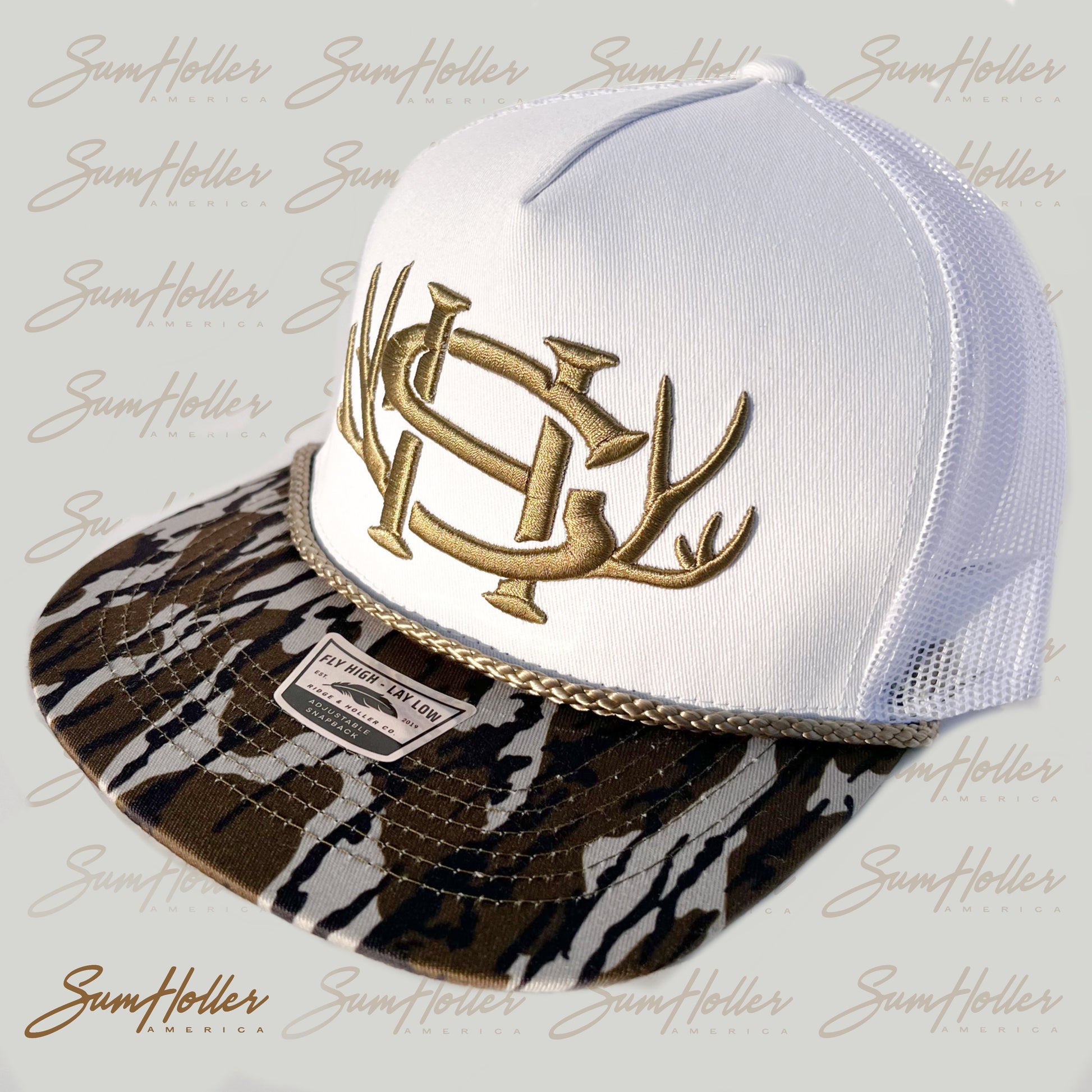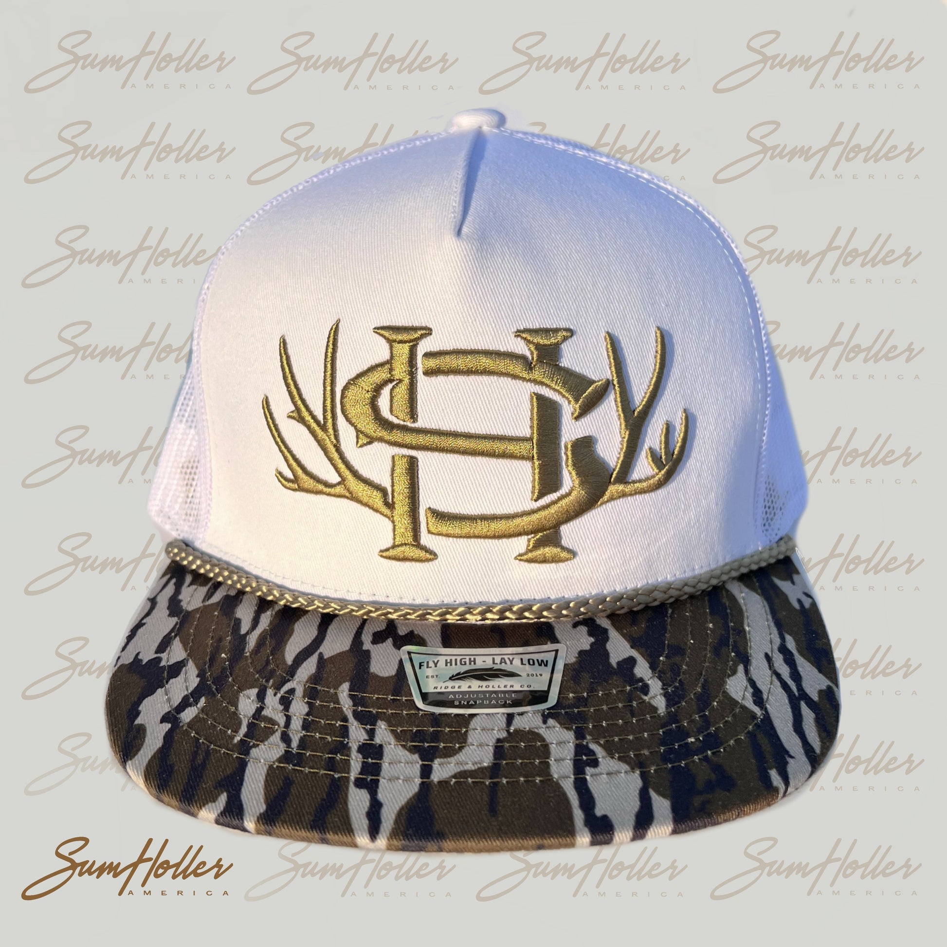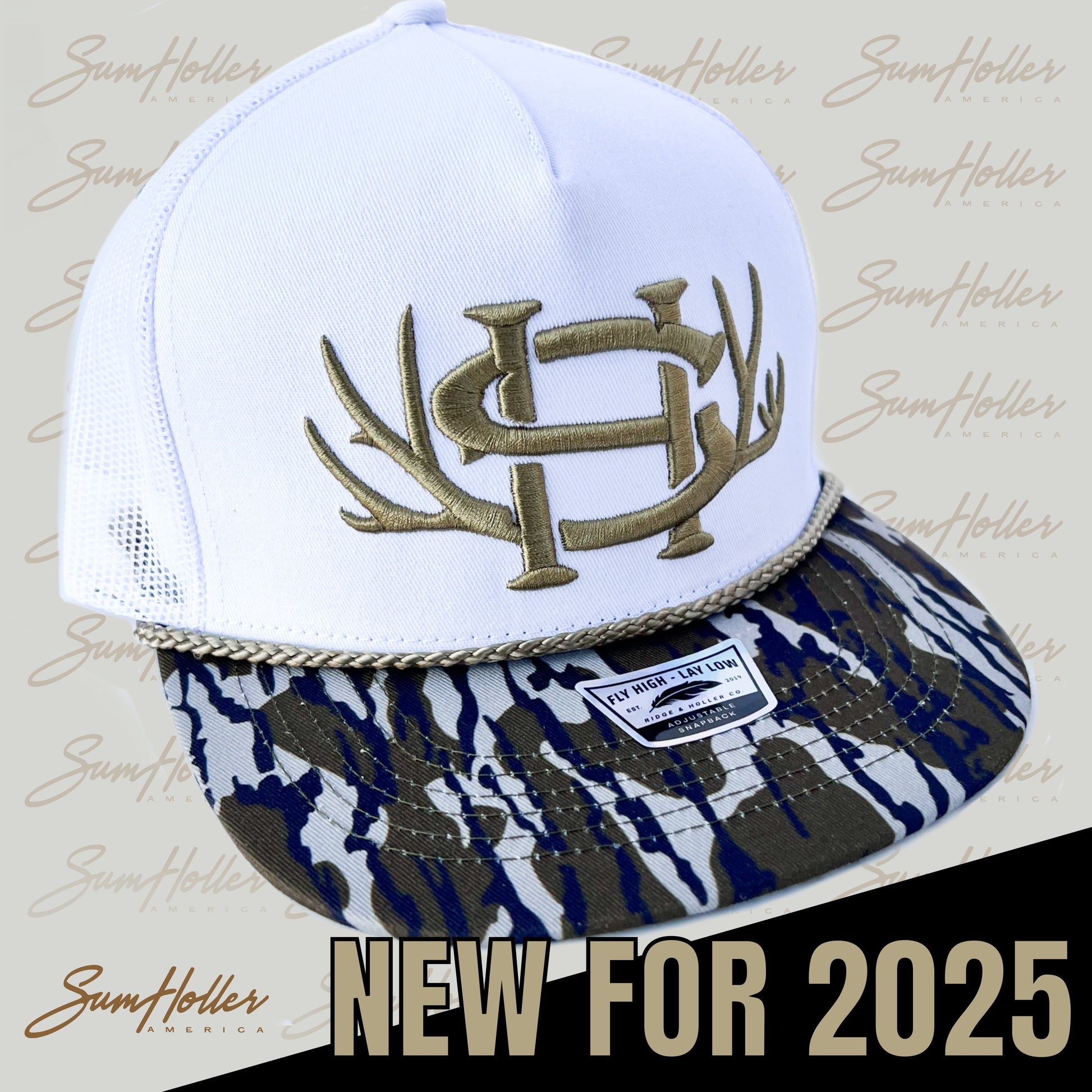 Introducing the newest member of the Sumholler family, SumRack Wilderness, limited edition. This hat features the iconic Sumholler logo on a white tall boy hat with a bottomland camo bill. Perfect for any outdoor lover, this tall boy cap is a must have and is a limited edition.