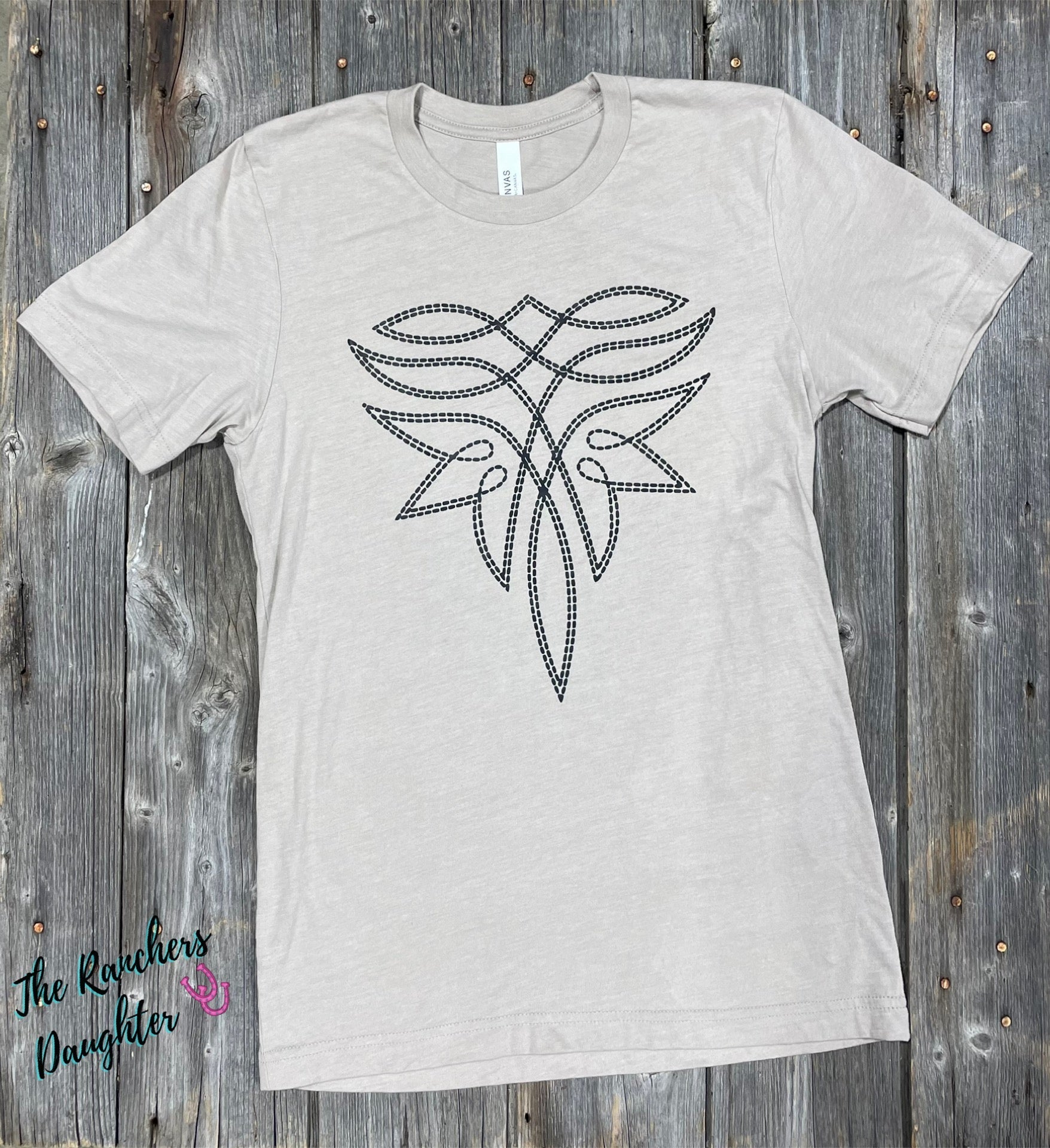 This tan heather colored tee with cute black western fancy boot stitch printed design will be your new favorite tee.