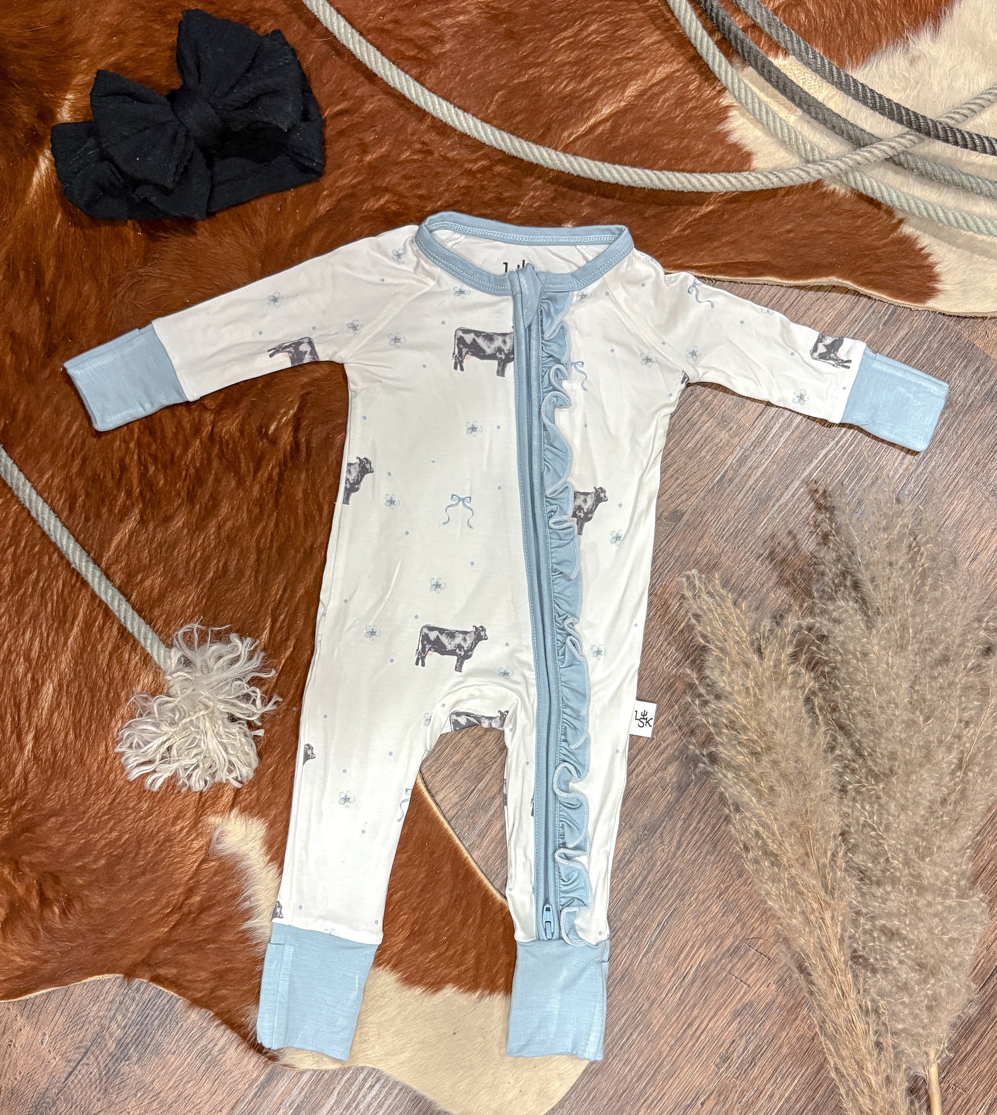 Round up the cuteness with our Danity Bluebell sleeper and matching two-piece set – perfect for your little cowkid’s adventures from nap time to playtime. Featuring a blue-and-white, Angus cow and bow print with sweet ruffle trim on the sleeper, this set blends cozy charm with western style.
