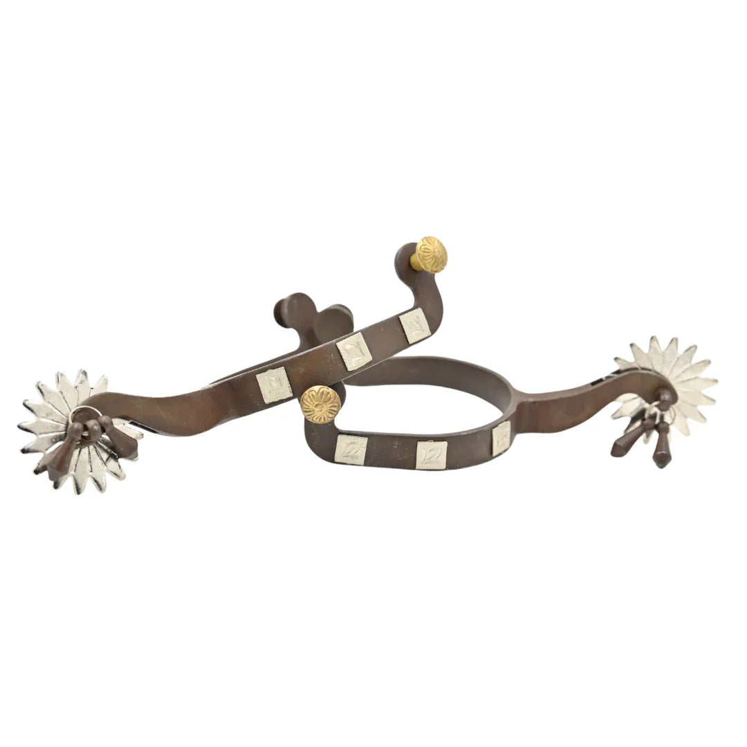 A narrow spur with just the right amount of bling! These show spurs are available with black steel or antique brown finishes. Silver overlay buttons feature a simple flower design while the band features three silver engraved square accents. Complete with jingle bobs and a large 16-point rowel.