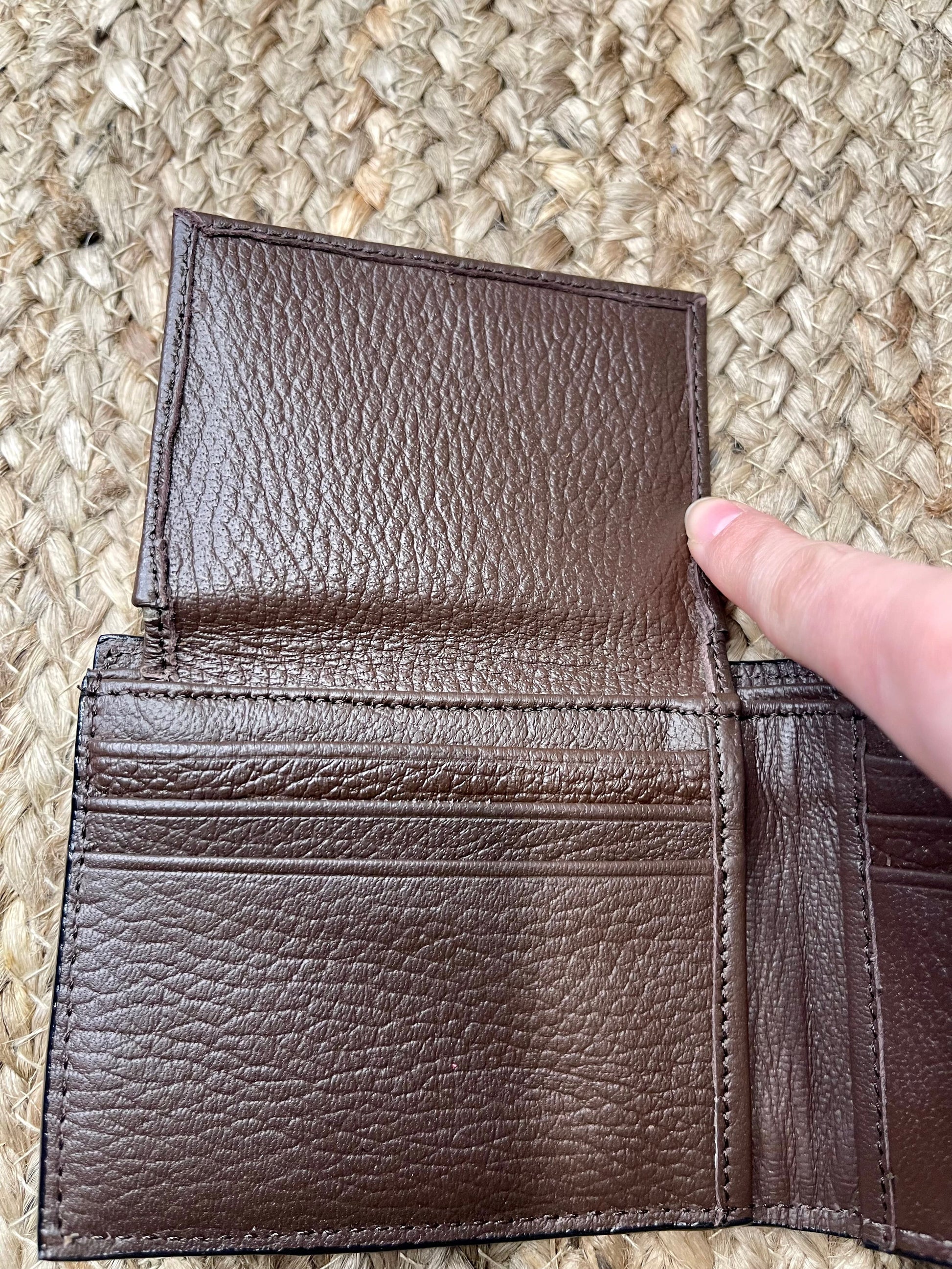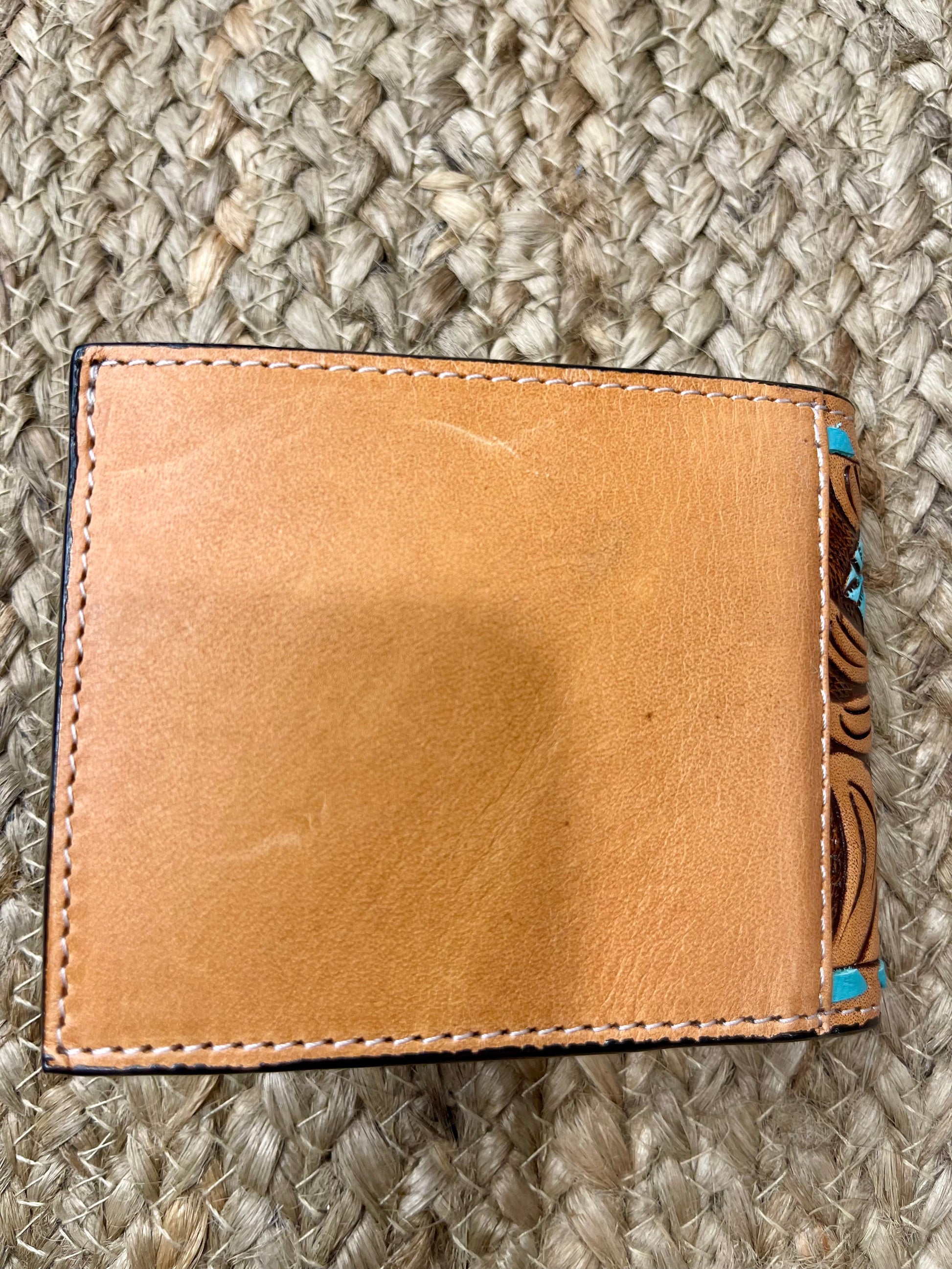 hand tooled, top grain leather, heavy duty stitching, multiple credit card slots.