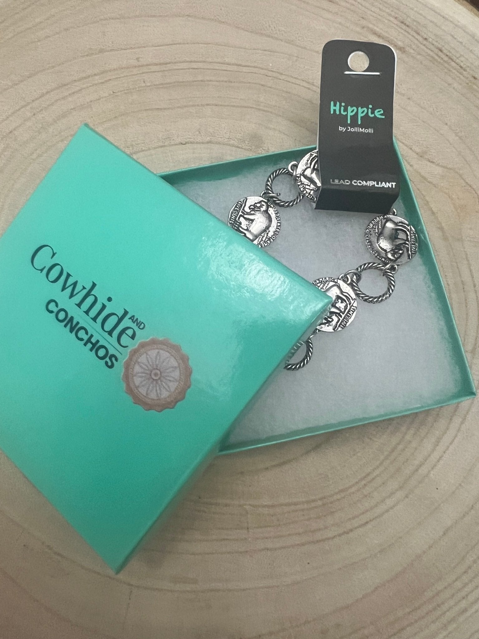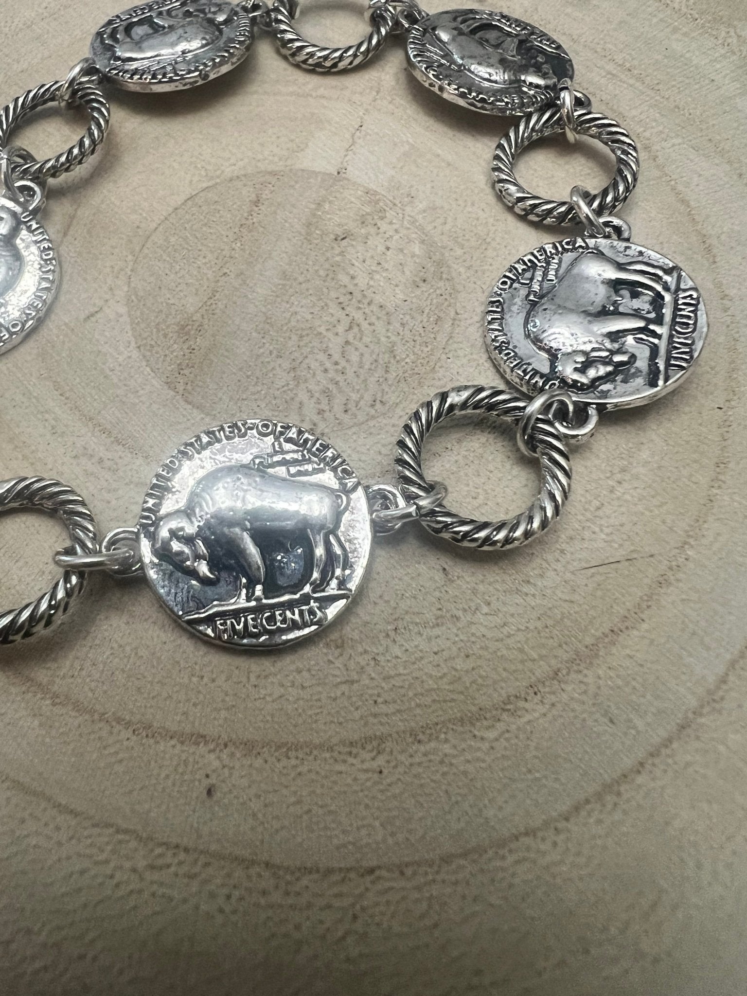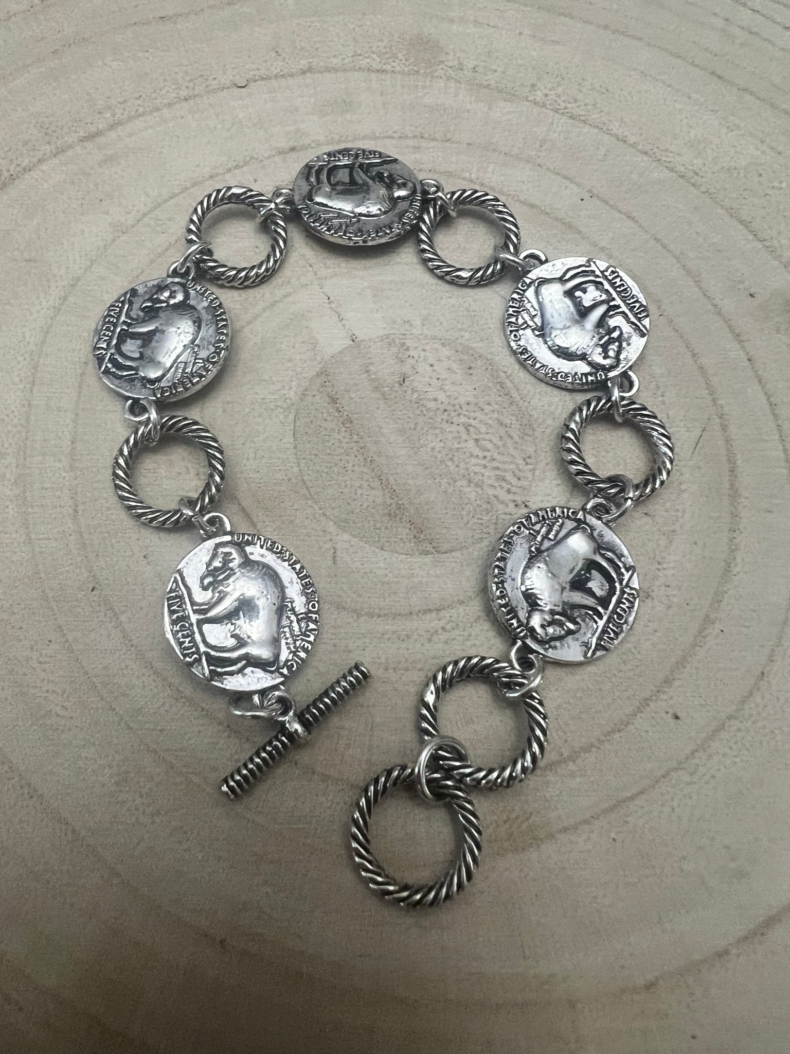 Instantly elevate your style with this stunning yet versatile toggle bracelet. Designed with a western buffalo coin motif, this faux bracelet will not only add a touch of western charm to your outfit. Don't settle for plain and boring accessories, try our faux Western Buffalo Coin Toggle Bracelet today and experience it for yourself!