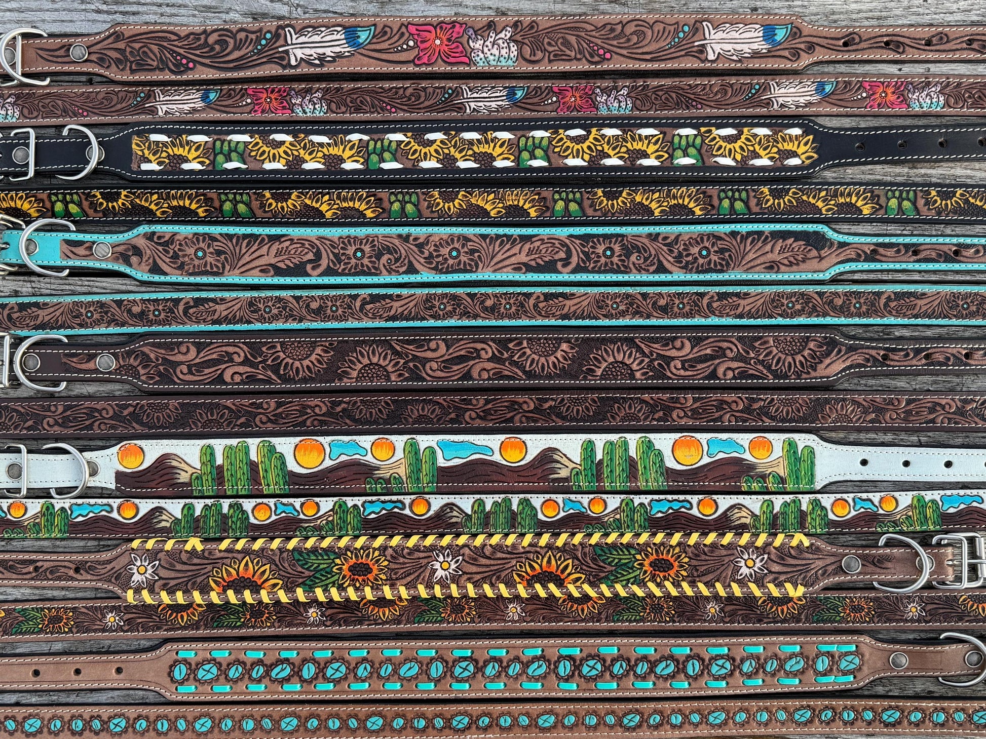 Western Genuine Leather dog collar or leash tooled details of sunflower daisy cactus floral turquoise feather