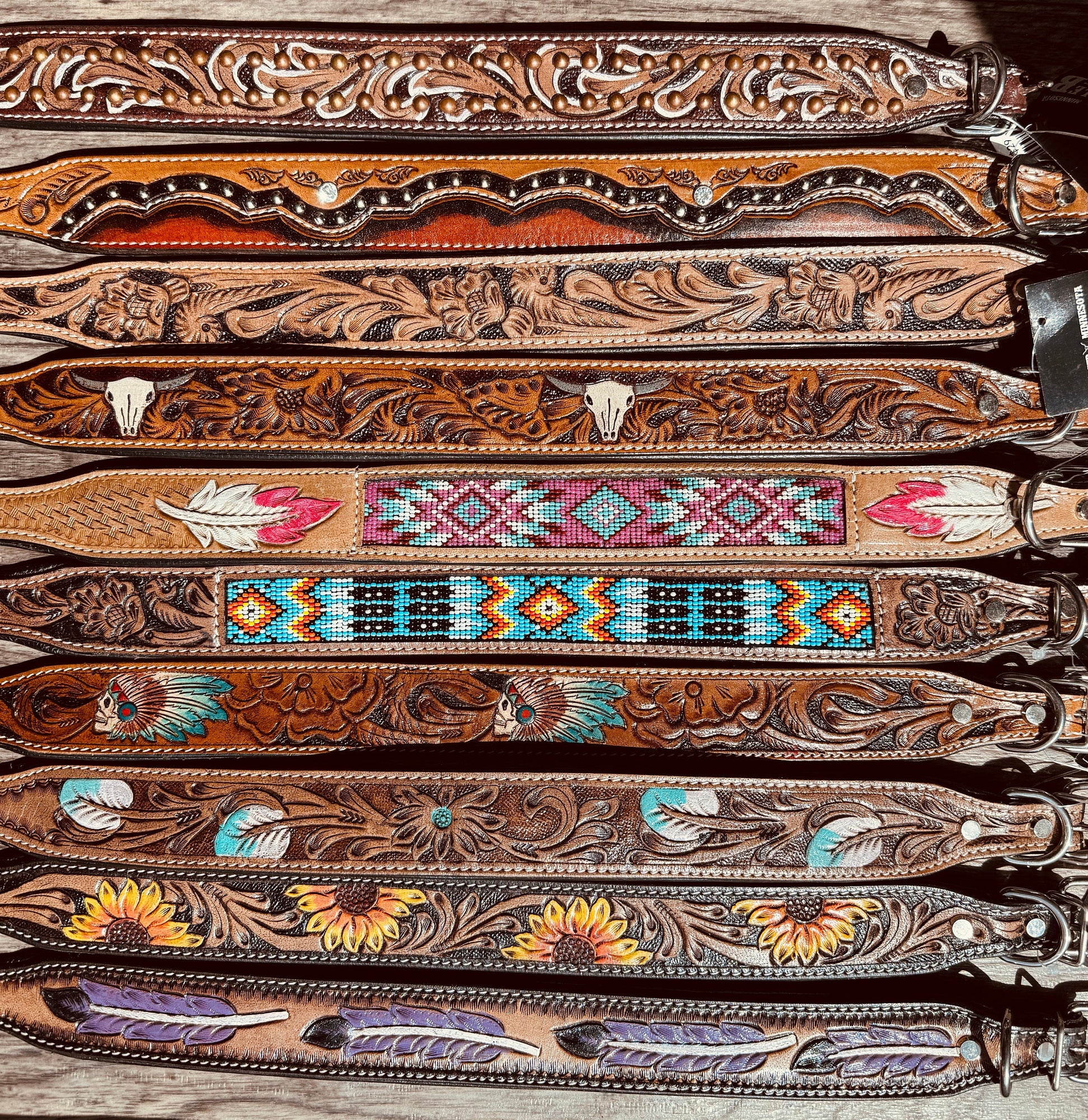Western leather dog collar tooled or beaded details skull sunflower feather rhinestone
