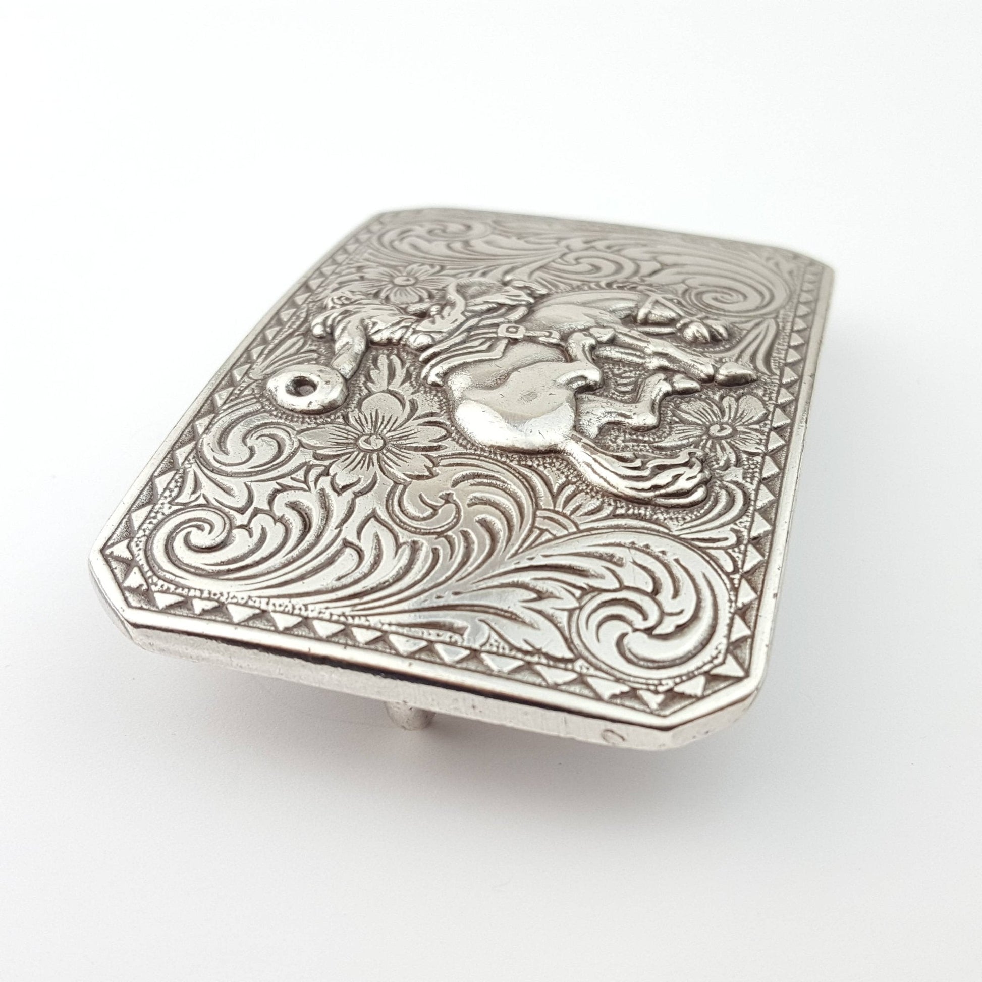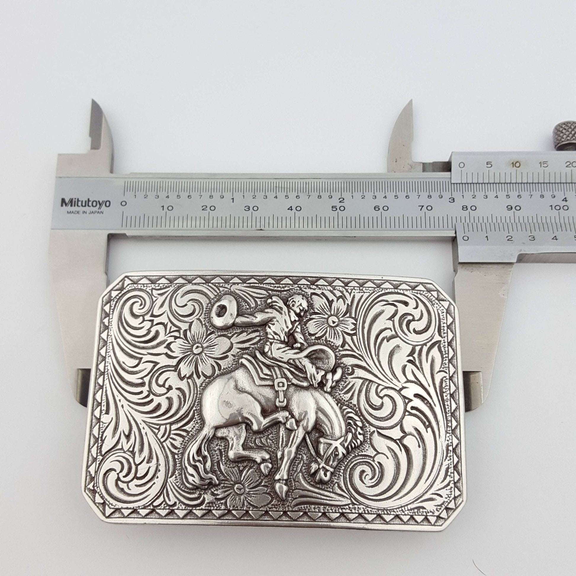 Crafted with fine silver metal plating, this belt buckle features intricate Cowboy Rodeo-themed details. Measuring 3.1" by 2.1", it’s a modest size suitable for both men and women. Weighing just over 3 ounces, it fits straps up to 1.75" (45 mm) wide, making it a versatile and authentic Western accessory.